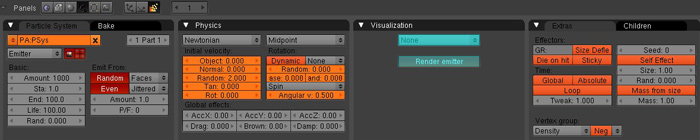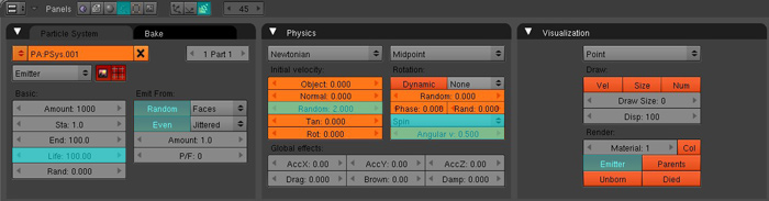Next up, we have todo get out of Edit Mode and bak in object mode. To make our Cube break apart we have todo use the particle system (a part of Blender i use a lot). Go todo the object settings (f7) and into the particle buttons and add a particle system todo the Cube. Let change some settings before we move on. Let change the life todo 100, turn on random and Even, change angular velocity type todo spin, and angular v todo 0.500. Lastly we want todo turn on emitter in the visualization box. You can se all those settings in the image below.