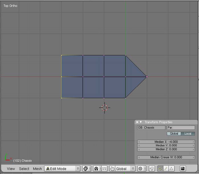 -select again the plane named sensor and in top view, select the two rear Faces. By typing Control + and Control + shift+f, divide the 2 Faces into 4 triangles like you did previously for the front part of this plane. This time, the Edges separating the triangles make an arrow head in the direction of the tail vertex.