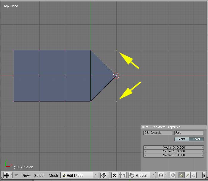 #009c -in front Ortho view, select the two vértices in the middle height of the Mesh, just before the center object location.