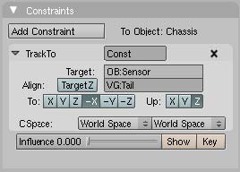 -Name the plane sensor. Select the chasis, and add a track todo constraint. In the file target, type sensor, in the field vg (vertex group), type tail. To = -x, up=z. Leave world space in the two cspace choices.