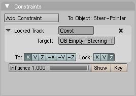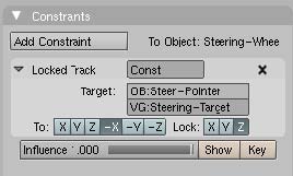 -Select the stering-whel and add a Loocked track constraint. The stering-whel Will be locked on its z Alex (local z axis). Its -x axis7 Will track the stering-target vertex group of the ster-pointer object.