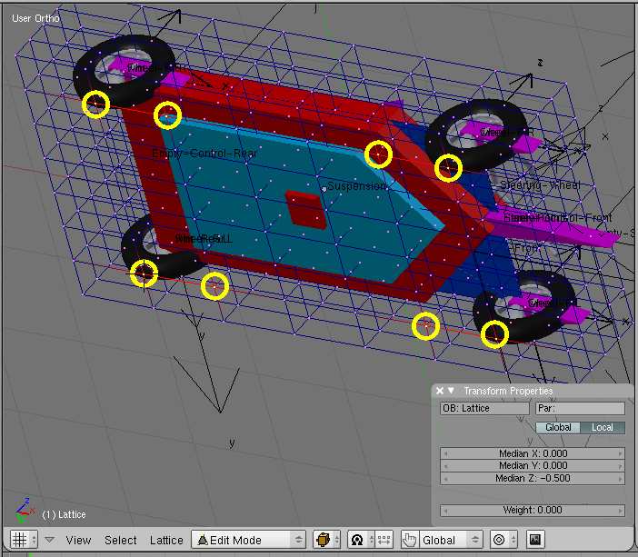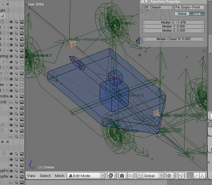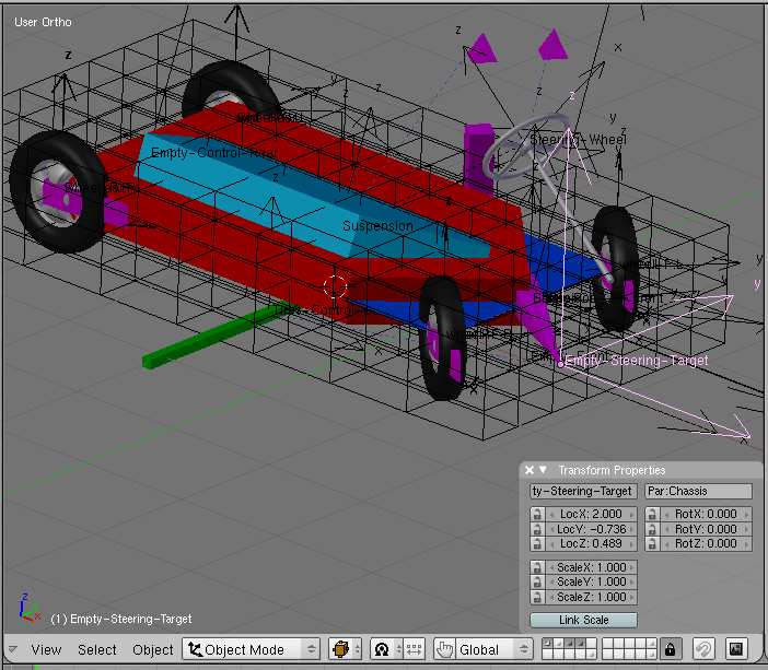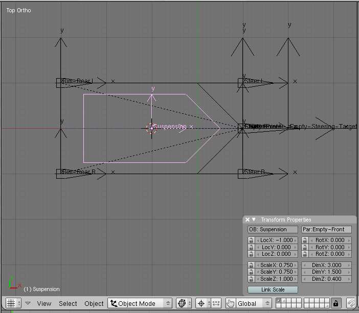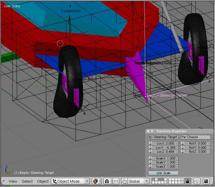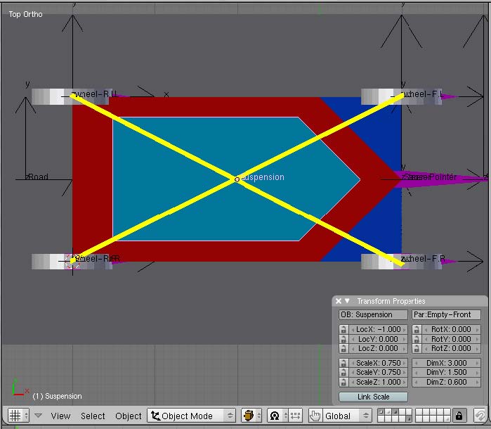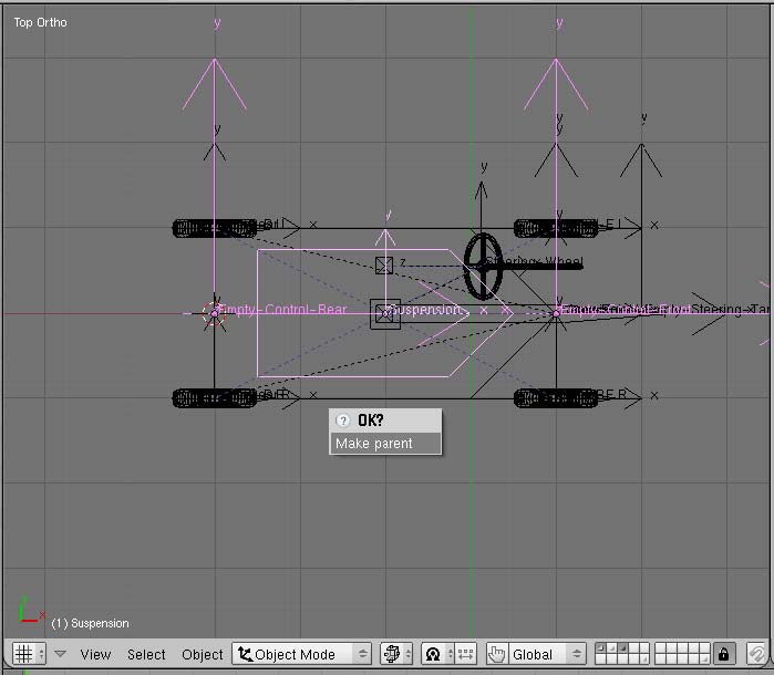 At the location of the chasis center, add an empty. Name it empty-control-front. Add an other Empty at the location of the tail vertex of the chasis. It is exactly in the middle between the two rear whels. Select the two new empties, and parent them todo the suspensión object.