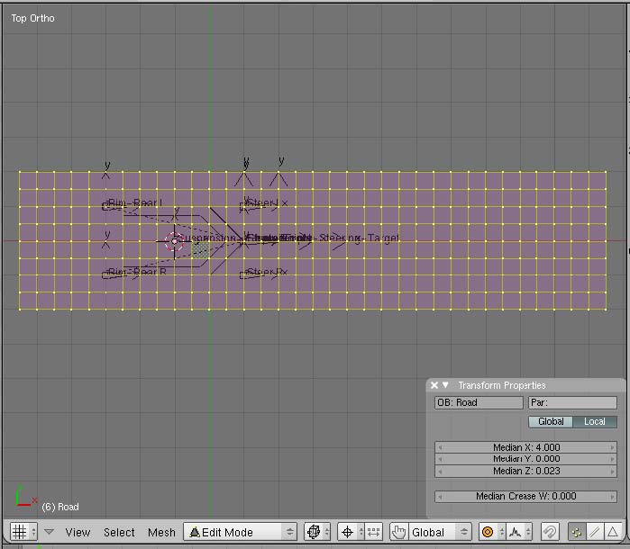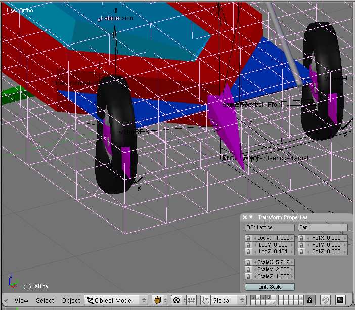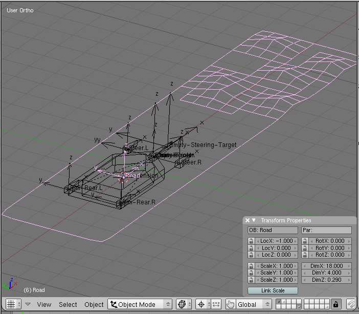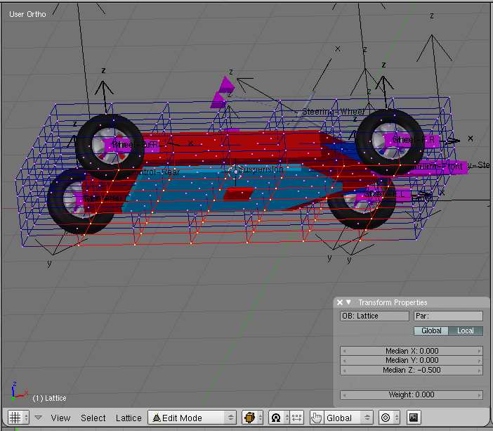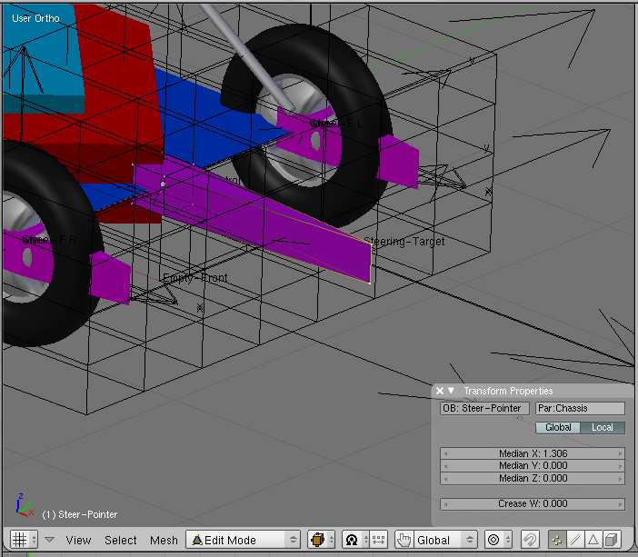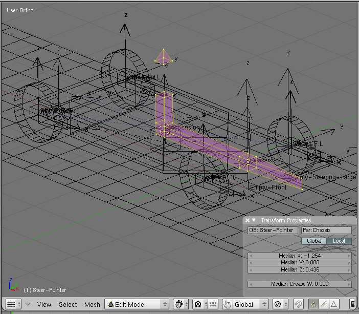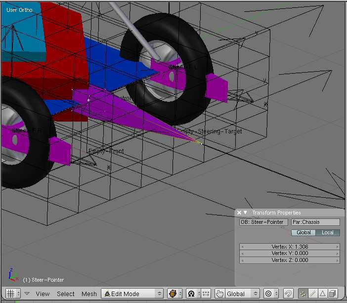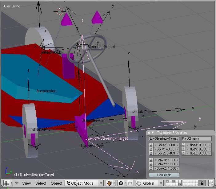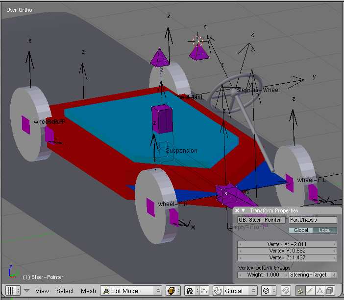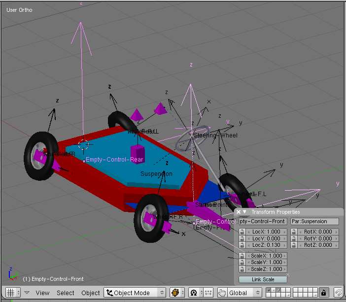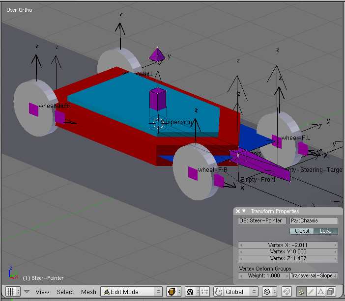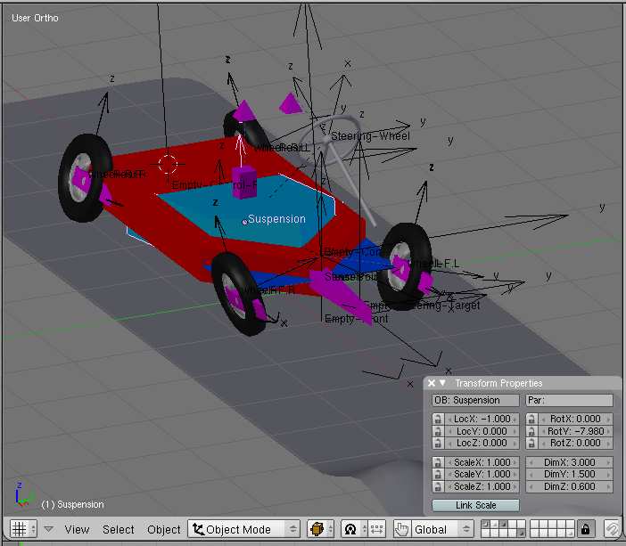 -The Purple object named ster-pointer has two vértices in two groups. They are used as tracking targets todo control the transversal slope of the suspensión object and the rotation of the stering whel.