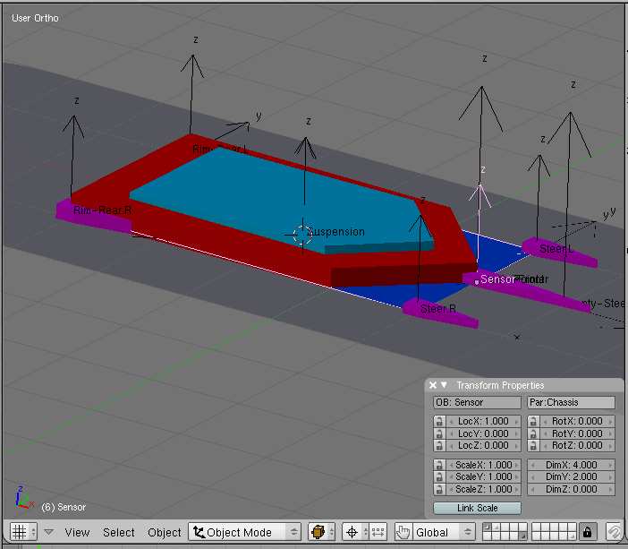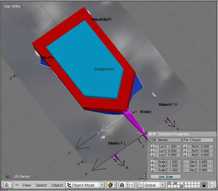 -select the suspensión and add four copy location constraints. Their target is sensor, and they are pointingto the four sensors groups f. L,f. R, r. L and r. R.-it is important todo set the copy location constraints using a diagonal crossing method : f. L with influence = 1.000 and r. R with influence = 0.500. Followed by f. R with influence = 1.000 and r. L with influence = 0.500.