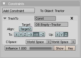 -select the chasis, and at frame 1 with the influence cursor of the constraint set todo 0.000, hit the key buttonin the constraint panel. A constraint inf ipo is created, showing one keyframe at frame 1.