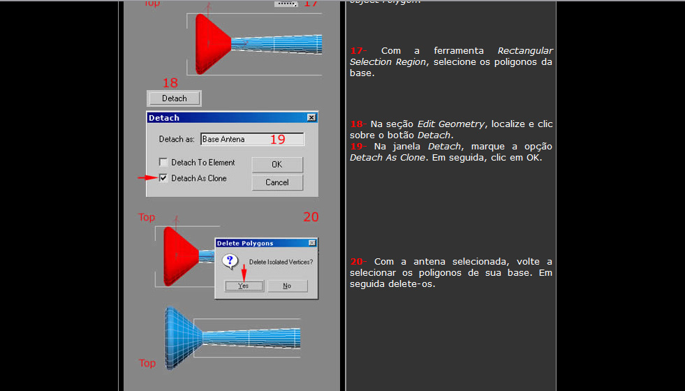En el tutorial se indica que se seleccione la base de la antena y pulse el botón detach (en el cuadro de diálogo que se abre marcar la casilla detach as clone y acepte) y a continuación volver a seleccionar los polígonos de la base de la antena y suprimirlo.
