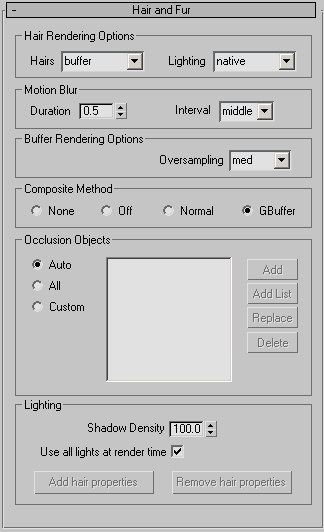 - -buffer: pelo procedural generado por Hair and Fur en el momento del render basado en los parámetros del modificador. Dispone de opciones de composición de imagen.