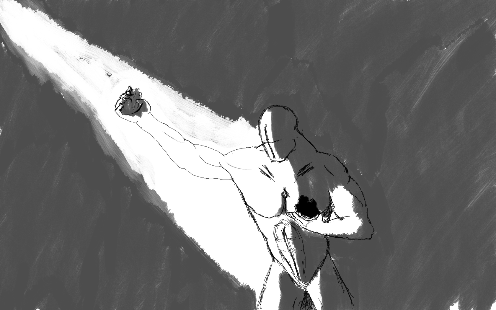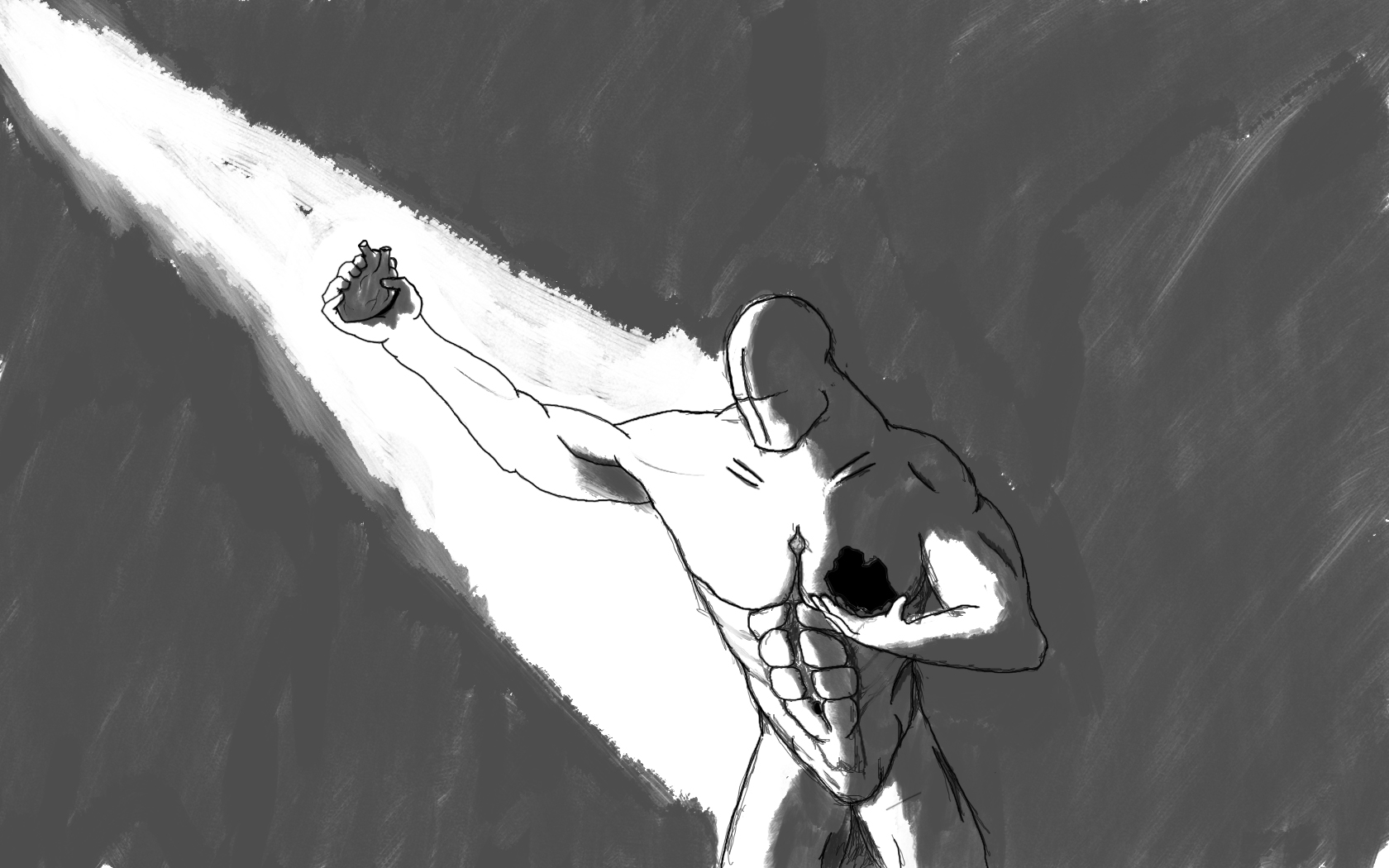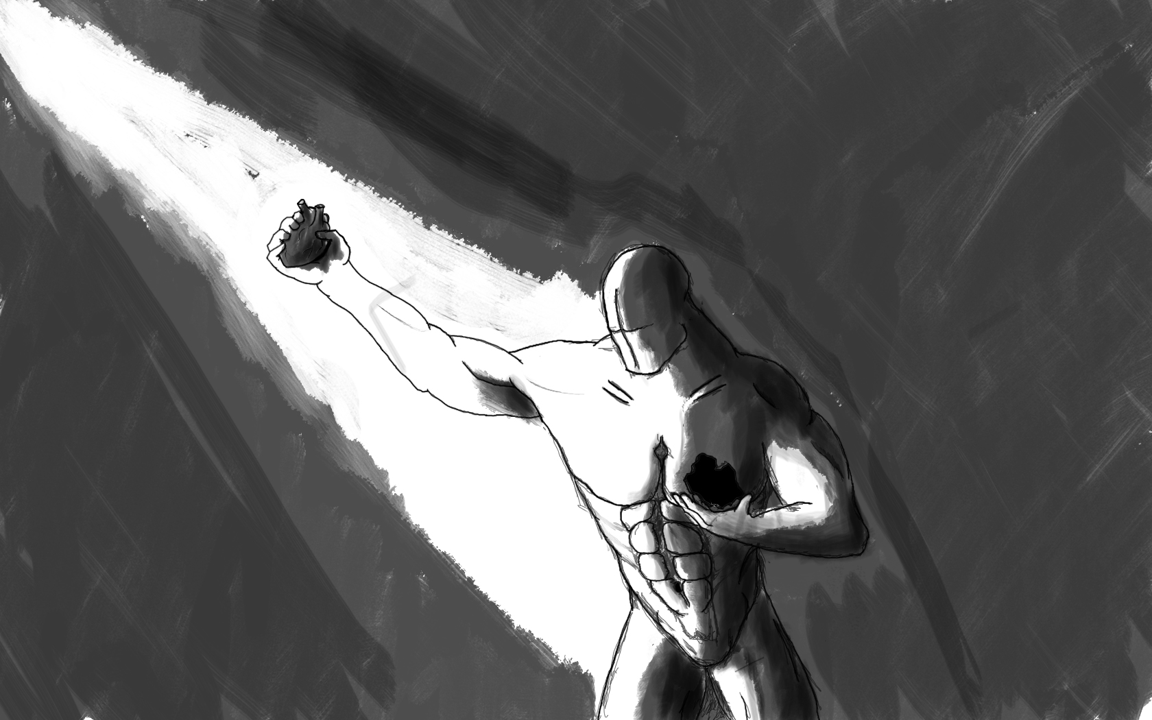 Hola Freeman, ¿Qué tal? El dibujo de concepto esta guapo y es muy expresivo, eso que ya tienes ganado, me gusta la mano con el corazón, pero el antebrazo se te ha quedado un poco largo. El hombro está un poco desencajado. Si tuviera el brazo extendido en línea recta al cuerpo le pasaría de largo la entrepierna y ese es justo el límite en el que debería ir acabando la mano. (es una referencia anatómica muy practica)
