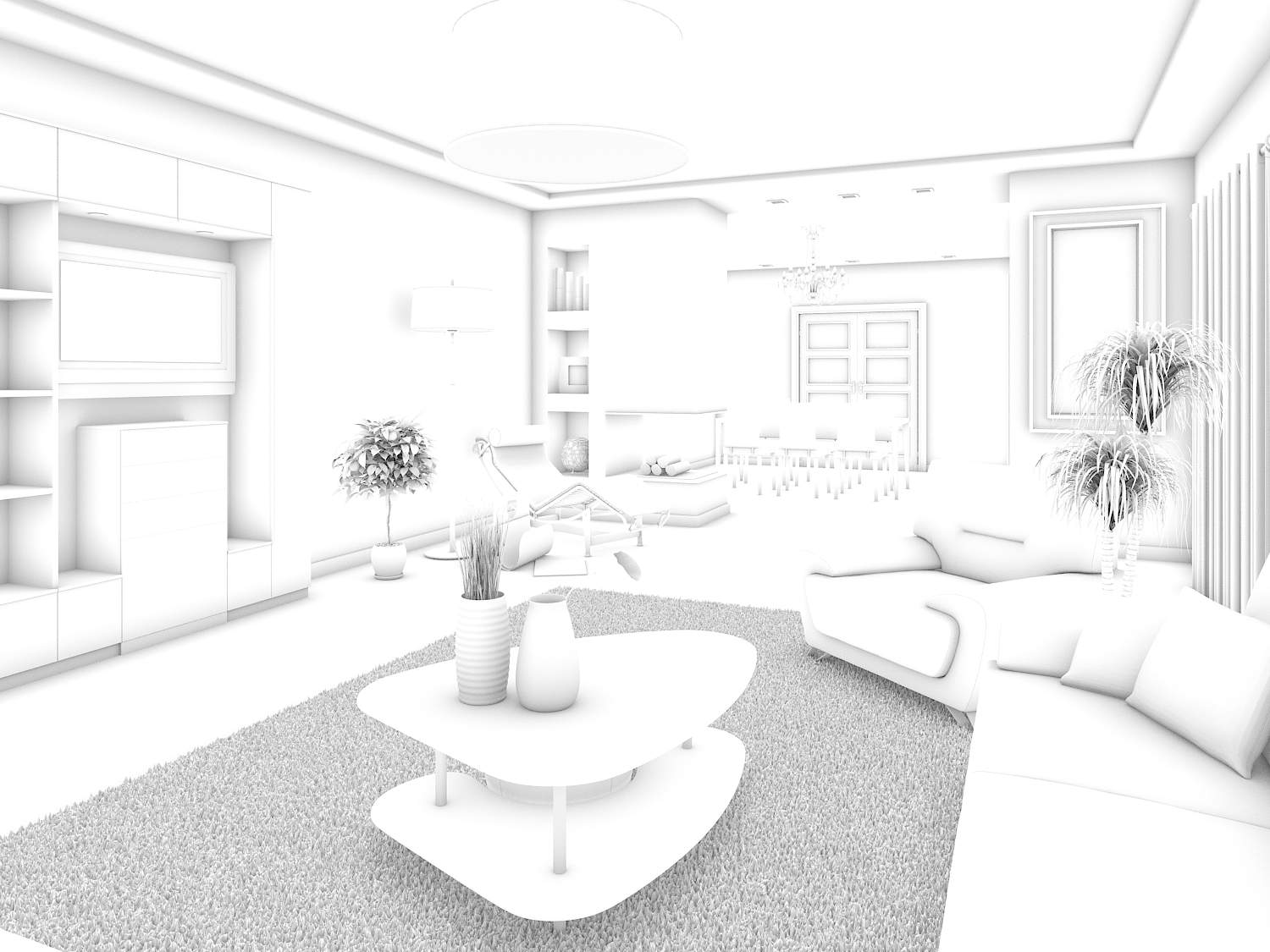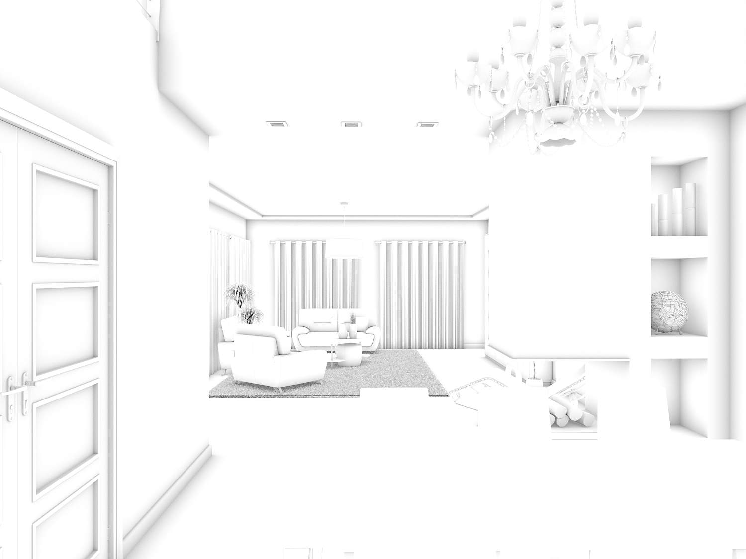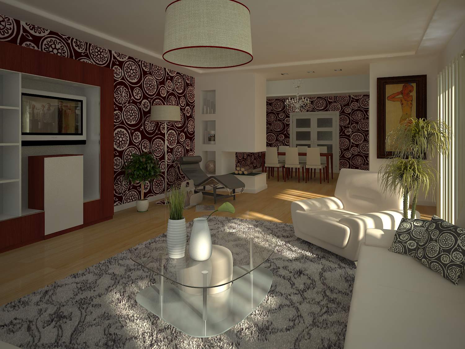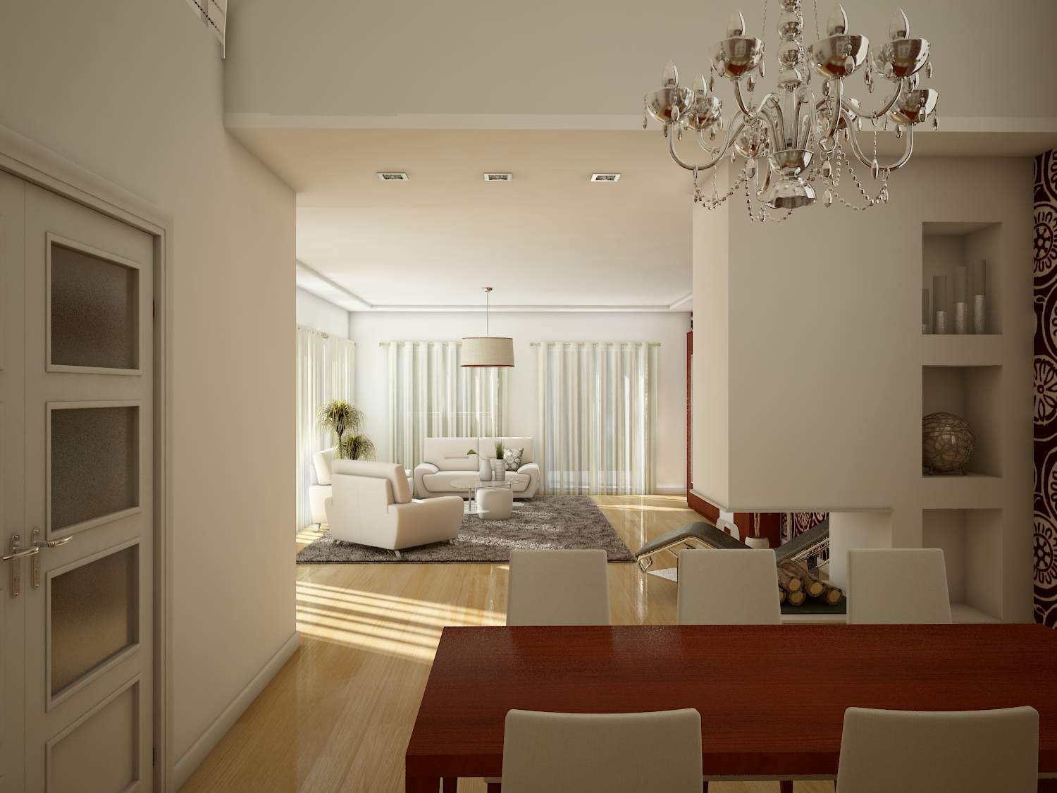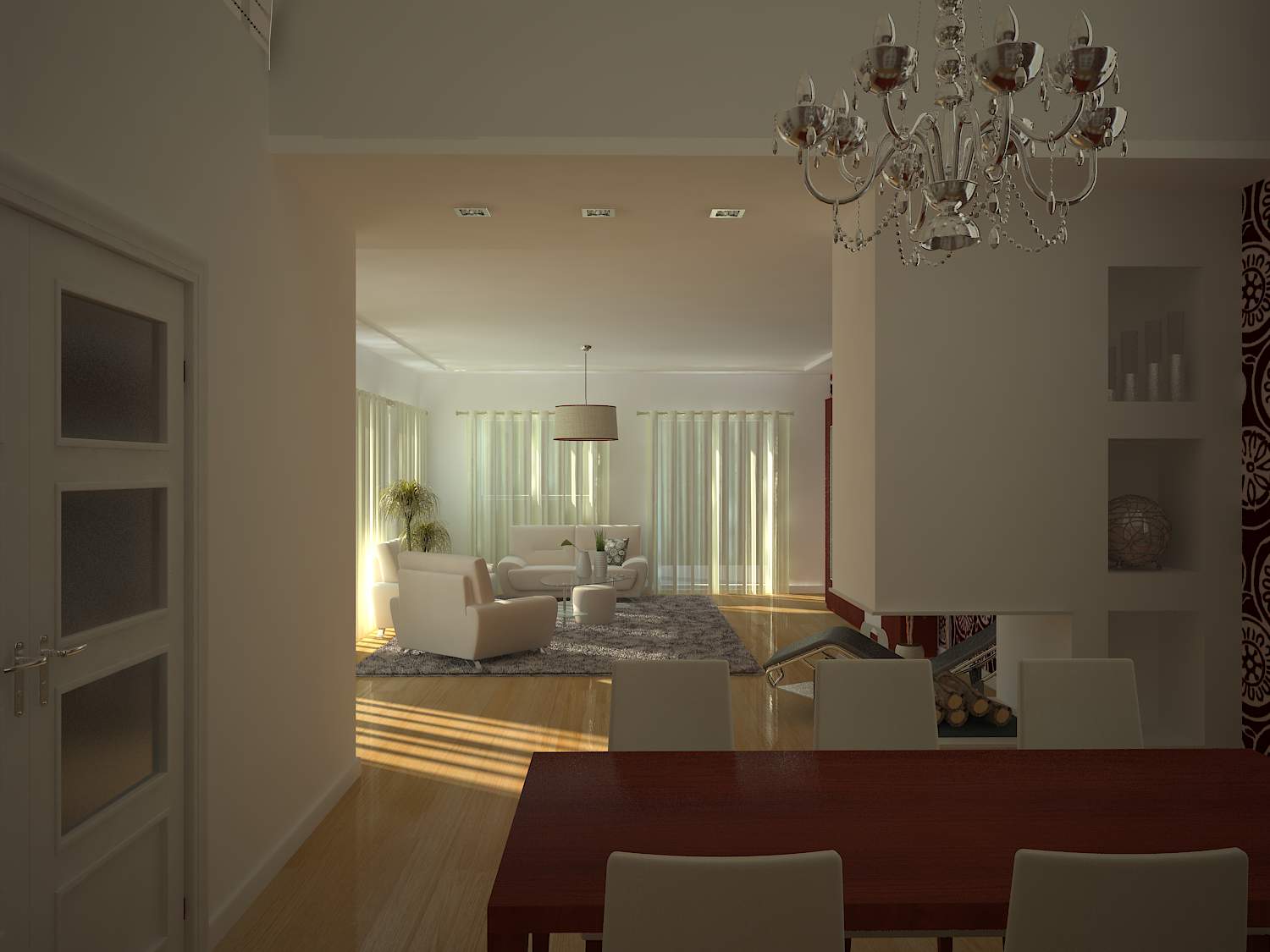 Dando respuesta a tu pregunta el salón está hecho con 3ds Max 2009, Vray y pothoshop, la iluminación es un v-Vraysun y las cámaras son v-rayphysicalcam.