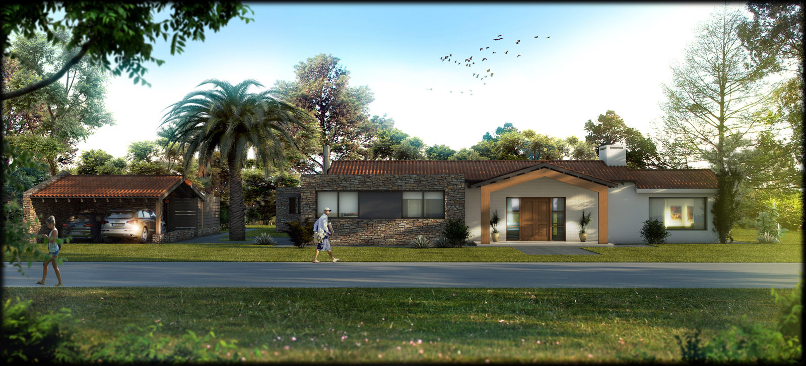 Felicitaciones la imagen muestra la arquitectura de una manera muy vendedora y eso es lo que se quiere, (los purismos, la verdad no son tan insalvables como para que sean tan importantes) la solución de arquitectura propuesta no me convence, me refiero a tener el estacionamiento de la casa desprotegido y lejos de esta, sin huella para los vehículos, pero en fin la imagen vende.