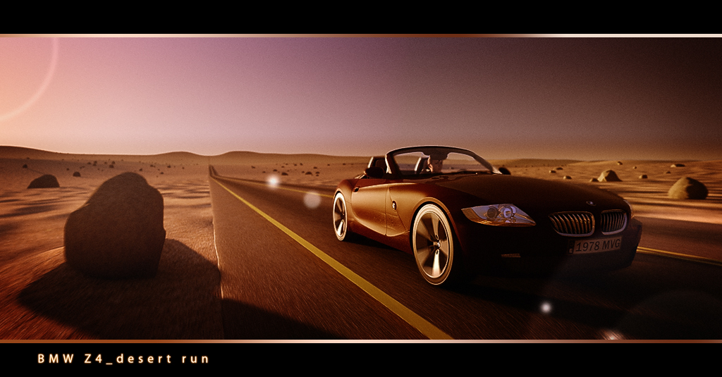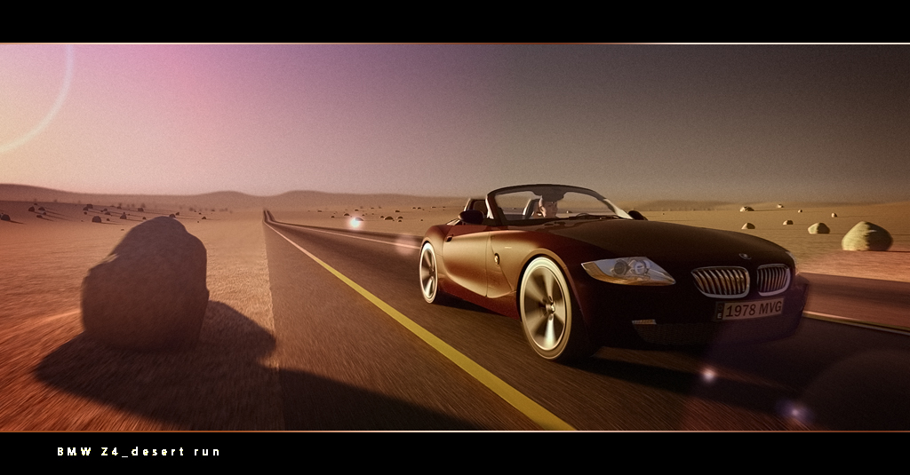 La luz en el coche y el modelo me parecen muy buenos, así que, en esa te felicito, me gusta. Sin embargo, ese blur que hay en el paragolpes izquierdo (del coche) queda raro de pelotas. Si el coche está enfocado y nítido, debe estarlo entero. Entiendo que las ruedas tengan blur, pero el parachoques no.