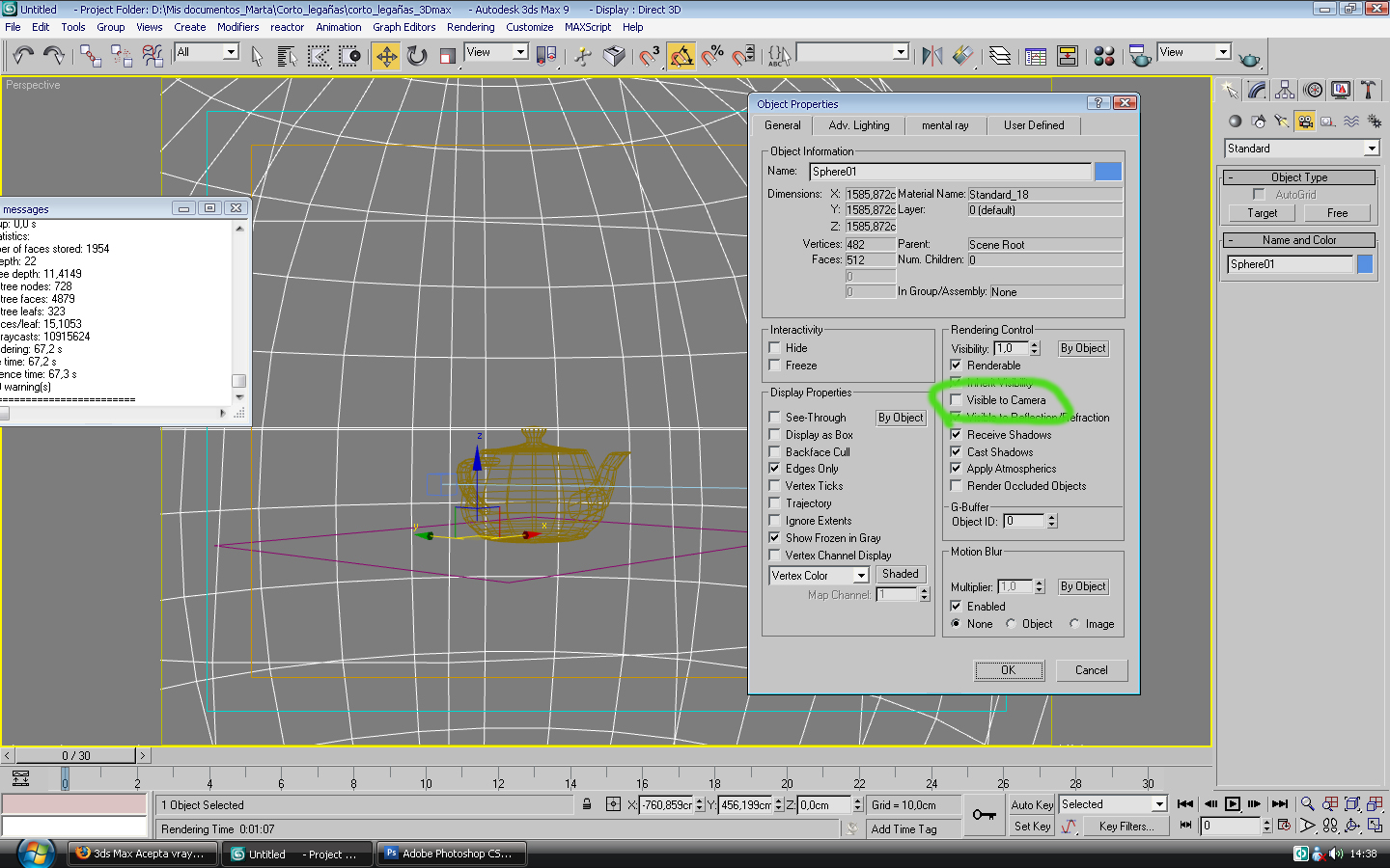Clickas sobre la esfera y botón derecho, object properties y quitas la opción visible todo cámara.