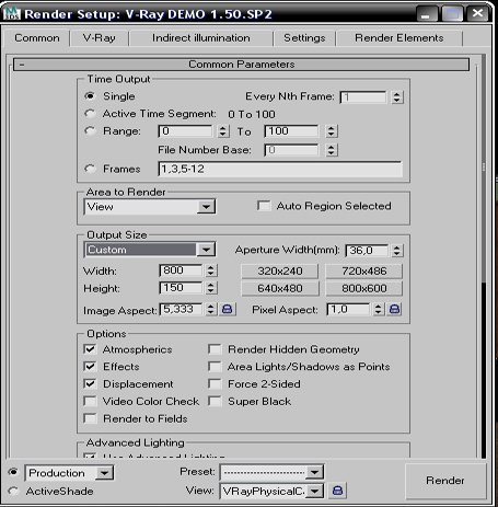 Gracias por contestarme José, mira la primera imagen es la imagen 800 por 600 de mi escena entera, pero a la hora de intentar renderizar mi escena entera a 850 por 150 hace lo que la da la gana y me la recorta como en la siguiente imagen, he probado lo de aspect y nada, también te pongo pantallazo de la configuración de la resolución, perdona por la primera imagen he tenido que borrar unas cosas vaya que me las plagien. Saludos, y muchas gracias de nuevo.