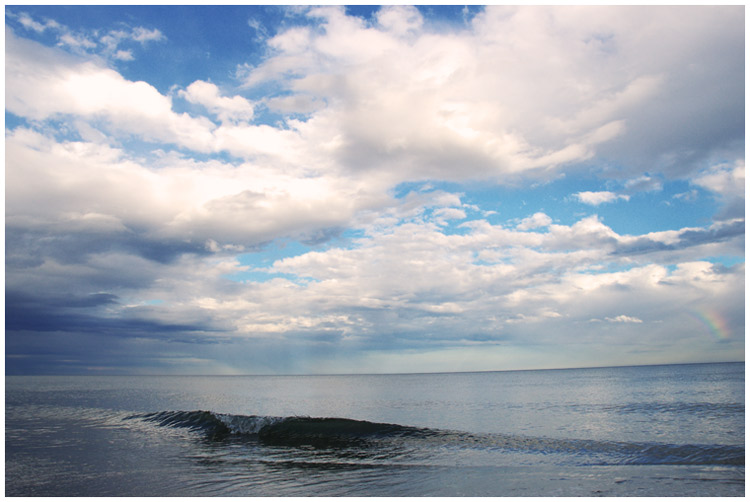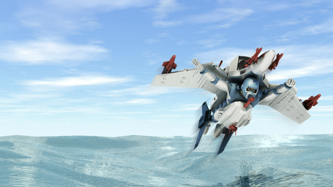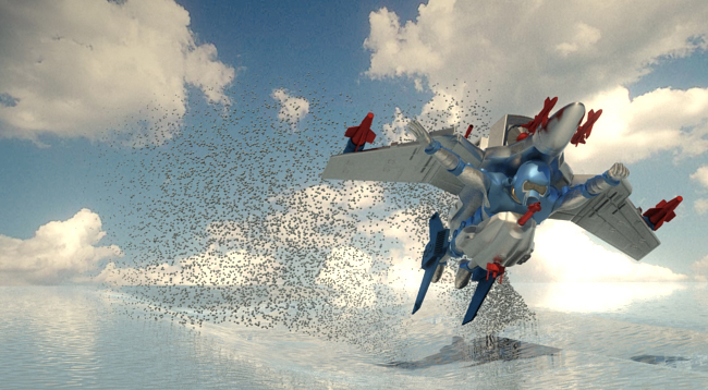 Que tal amigo? Va muy bien, quizá la textura del robot o lo que sea aparenta de juguete. Las partículas como dices parecen abejas al asecho. Por último generalmente las nubes que chocan contra el mar están tan lejos que pierden detalle, de última hace que el cielo choque contra el mar y no las nubes, (mira la fotografía que adjunto). Saludos.