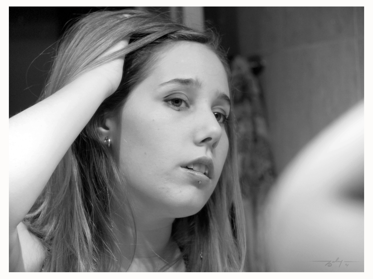 La cuarta y la quinta me gustan las expresiones de la chica, pero quedan composiciones demasiado encerradas para mí gusto. El que le corte ligeramente la cabeza en el retrato de primer plano (la cuarta fotografía) o el poco espacio y corte del brazo derecho (en la izquierda) en la quinta, quizás sean los causantes de que me de esa sensación.