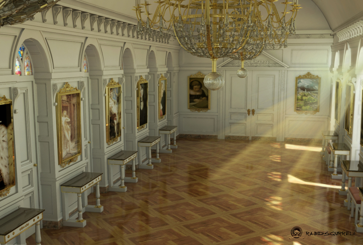 Este trabajo tomó un poco menos de 2 semanas, modelado en 3dsmax 2009, renderizado con Mental Ray y unos retoques en Adobe Photoshop. Algunos quizás reconozcan algunas imágenes conocidas entre las pinturas, que tienen cameos especiales de anette olzon, nightwish, los argonath y minas Tirith. También esta mi novia en una de las pinturas. Espero sus comentarios y ojalá les guste.