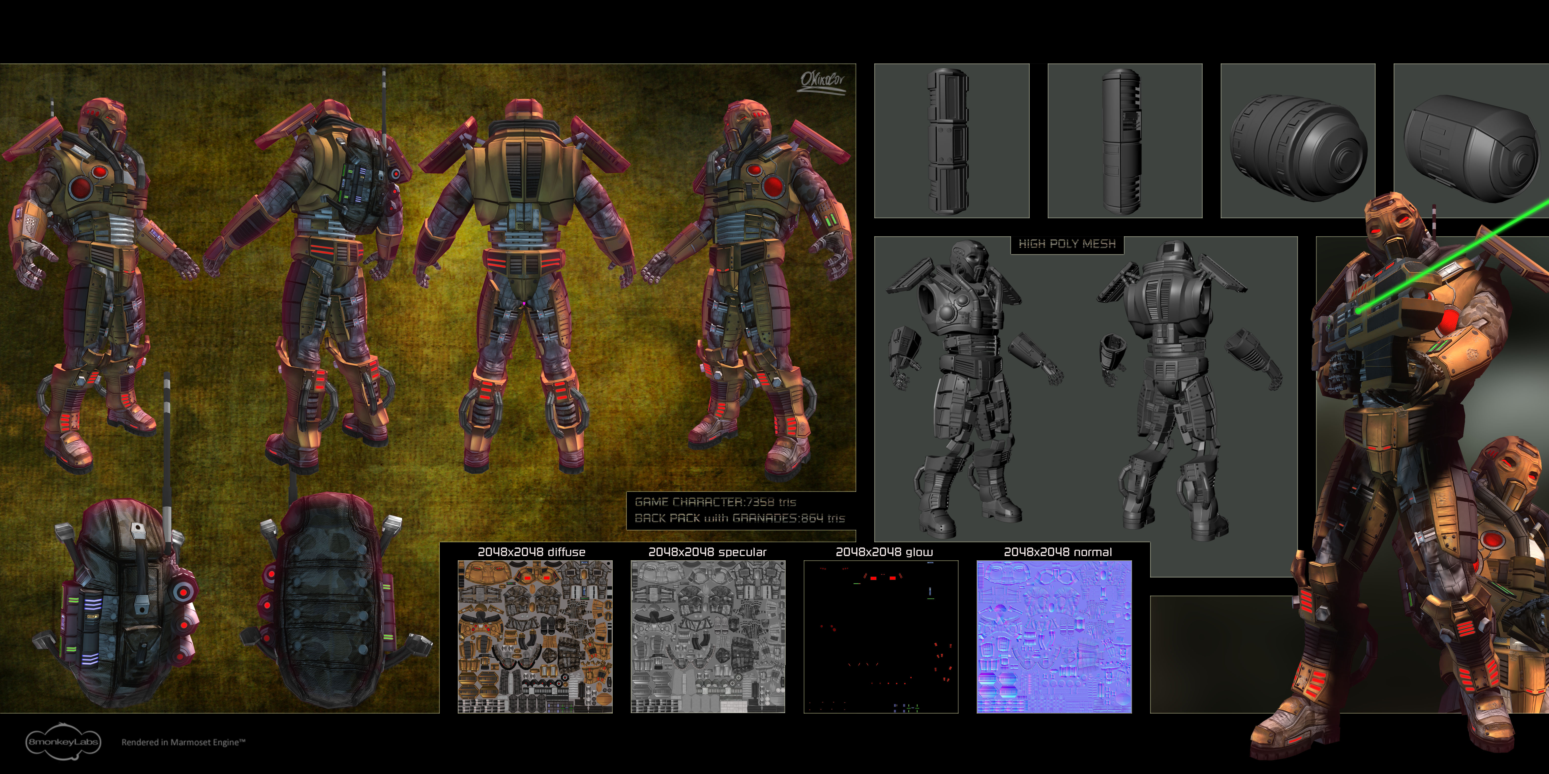 Me alegro de que te gusta. Son las mapas estándares. El primero es para la textura. Normalmente para la textura en Adobe Photoshop primero me creo una paleta de colores para el personaje, (unos 3 o 4 y cada uno tiene una variacion)me hago unas tres capas y cada capa representa un color. Por ejemplo, tengo solo una capa para la ropa, otra para el metal negro y para cada metal por diferente. Arriba del todo me pongo una textura Occlusion en multiply a unos 80% y debajo de ella un cavity en multiply entre los 50% para las sombras. También al Normal Map le hago desaturate y le controlos levels y lo meto en la textura a veces para sacar un poco de luz o reflexiones an elgunas zonas(pero ha veces esto puede ser una tarea sucia)la segunda textura es el Specular que es para las refexiones(la luz que recibe) el modelo. Ya lo sabes, más negro no recibe luz y más blanco recibe bastante. Para el Specular primero cojo la textura que ya tengo preparada y le hago desaturate y la pongo más abajo. Arriba de ella creo unas cuantas máscaras para cada tipo de piezas y los controlo con los levels para obtener más negro o blanco. Y al final cojo mi Normal Map y en su canal copio el canal rojo y verde y creo dos capas con ellos. Cada capa la duplico una ves y los dos duplicados les hago invert. Queda así. Red channel, arriba es el red channel copy(invertido),gren channel, arriba del green channel invertido. Ahlora a cada una de estas capas en los levels le pongo en el input 128 1.0 255 y el output 128 255 y pongo las cuatro capas en lighten una sobre la otra y les hago un merge a las cuatro y con esta textura controlo un poco más el especular. La tercera son las luces. No tienen nada especial. En Maya se ponen en incandescence y se pueden ver con el high quality rendering activado o en Unreal creo que es emissive creo. Y la última es el Normal Map que he scado en Maya y me ha salido en un 98% sin seam. Pero si que chupa Ram como loca Maya para hacer esto. Me olvidaba. El Occlusion lo saque desde el Normal Map usando el Xnormal.