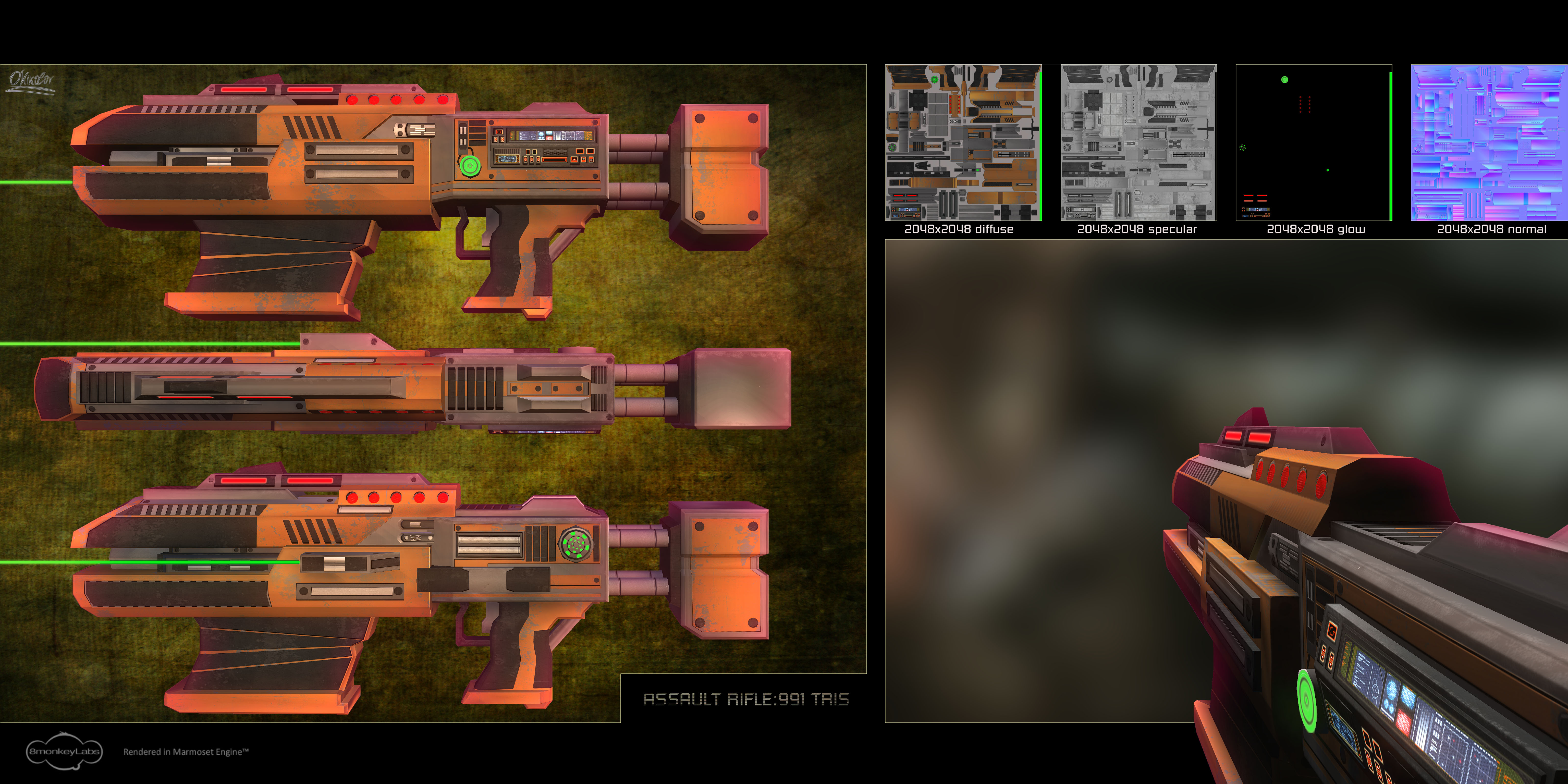 He conseguido adelantarme a enseñar algo antes de que se acabe el año. Me atrevo con algo Low poly. Mas bien es como un personaje secundario del tipo que te puedes permitir variación de textura y llenar la escena de ellos para que te ataquen y por esto me puse un pequeño límite para el personaje y el arma (la cual esta pensada ser vista desde tercera persona)modelado en Maya, (la ropa y ralladuras en ZBrush), textura en Adobe Photoshop y render en el Marmoset Toolbag. Algunos veréis que algunos de los renders me han salido un poco secos y como Skin Shader en el metal, pero es porque el Marmoset solo puede guardar renders en 24bits Targa sin transparencia. Por esto tenía que poner un fondo claro en el programa (en mi caso rosa)para poder quitarlo en Adobe Photoshop y quedarme solo con el personaje en limpio, pero por lo visto al usar este método el fondo si que pone algo de luz no deseada al personaje. Algunos de los renders se ven mejor. Y como quitamos algún que otro artefacto en las sombras escucho más críticas. Ojalá os guste.