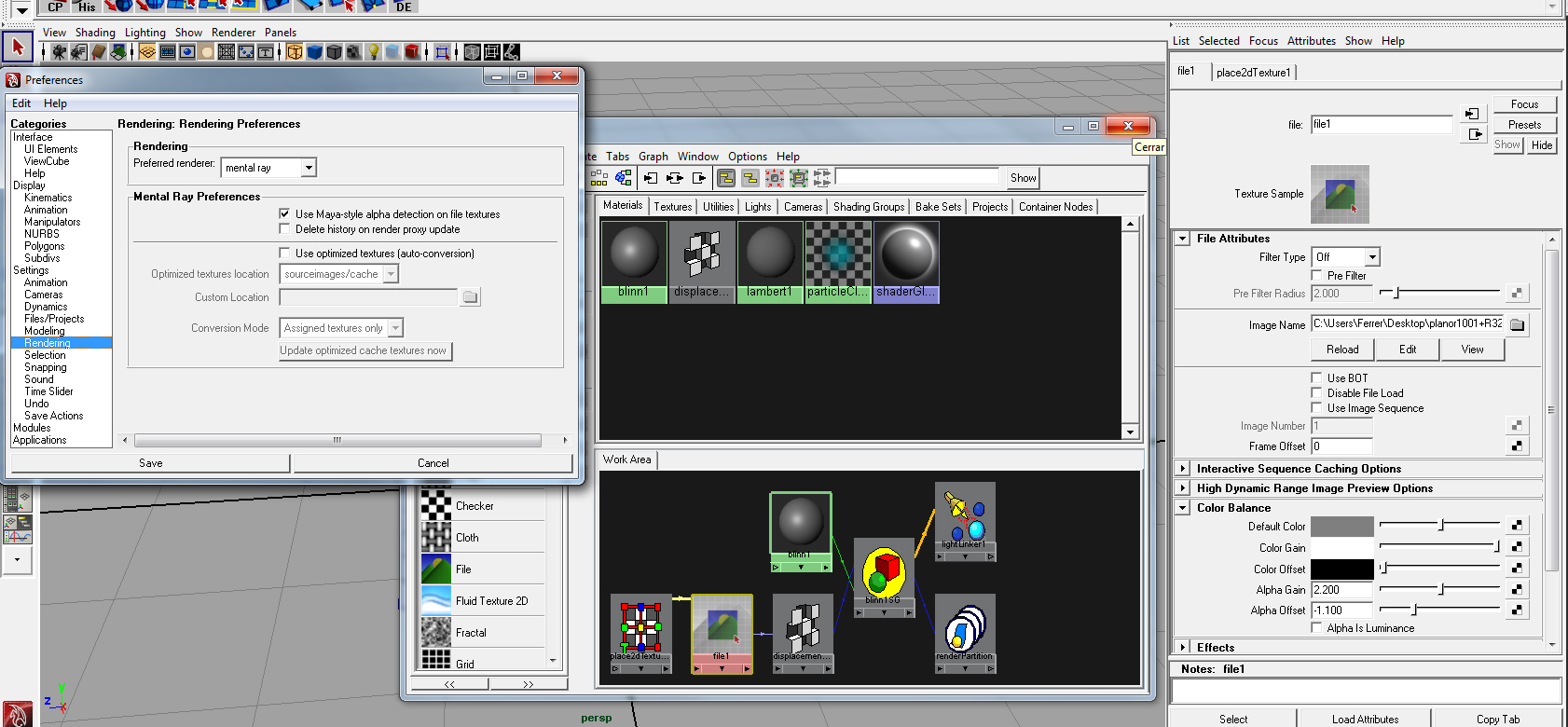 En el hipershade le asigno un Blind, arrastro el nodo displacement, selecciono como displacement, abro el archivo.map, pongo el filtro en of, en color balance pongo el alpha gain a 2.2 y el alpha offset a -1.1, también como dice en el libro he activado en preferencias el use Maya-style alpha detection on file textures.