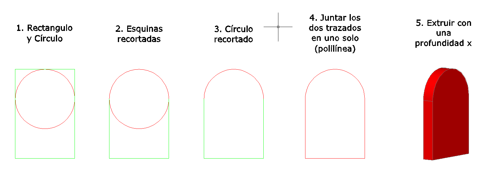 Hola David, adjunto dos posibles soluciones, la primera es similar a la que comenta Frank, solo que en vez de dibujar directamente la polilínea, he trazado el círculo y el rectángulo, luego los he recortado y posteriormente transformado en una polilínea (comando editpol, opción juntar), porque para poder extruir un objeto 2d, éste siempre ha de ser una polilínea cerrada.
