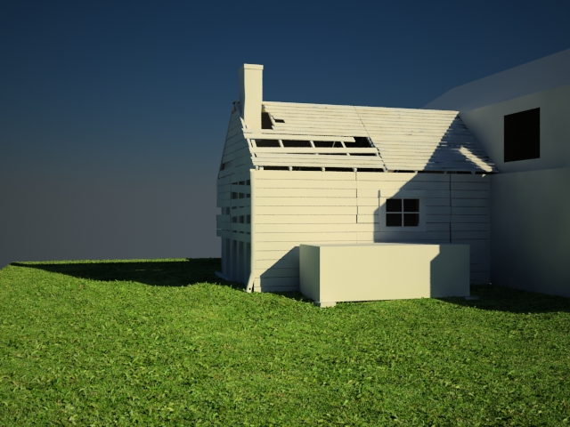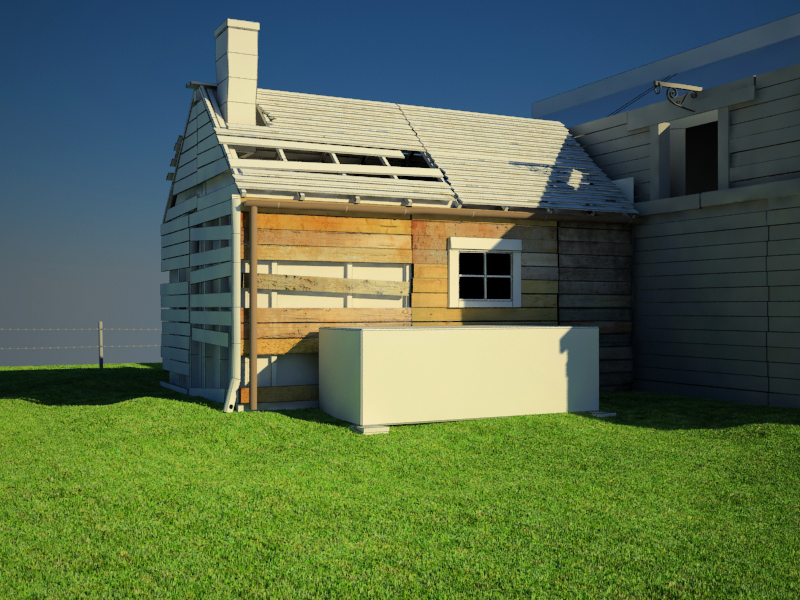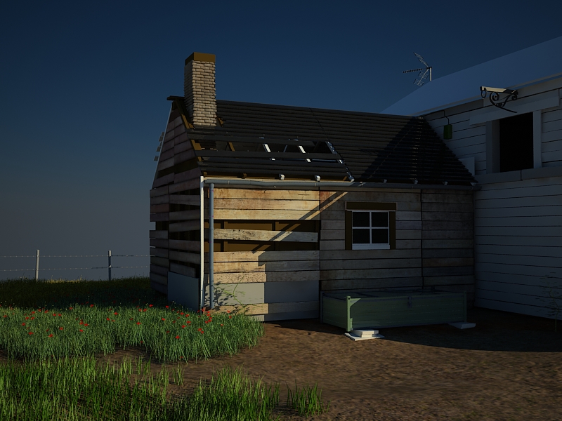 Llevo varios días peleándome con los settings del Vray. Me gustaba más al principio, pero empecé trabajando sin unidades y tenía problemas con los viewport. Al escalarlo, se me han cambiado los parámetros. No logro conseguir el cielo tan azul como quisiera entre otras cosas. Me quema bastante la imagen, pero no sé que tocar, si el Vray Sun, el primary y el secondary en el GI engine, el Vray Sky, etc. Tengo una chimenea modelada y creo que pondré el modelo en lugar de un mapa con Normal Bump (como esta echa). El contenedor ira con texturas. Y pienso ponerle una sombra de árbol, así como hojas y suciedad sobre el césped. Éste tengo aún que asalbajarlo, así como ponerle barro en algunas zonas. Bueno, a ver qué se os ocurre.