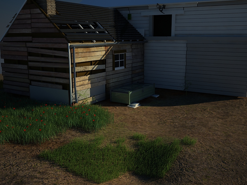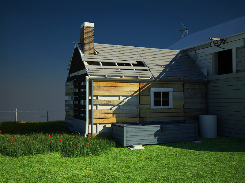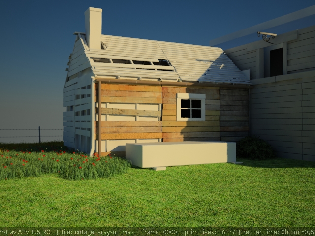 La semana pasada empecé a modelar en Low poly una casa, por aburrimiento. Y decidí seguir trabajándola. Escribí cottage en Google image y la primera fotografía que vi me gustó y la cogí como referencia. Quiero que esté destartalada, pero que se vea vida en ella. Quiero que aparezcan objetos modernos, como barriles de plástico, alguna caja de cartón, una bombilla, etc. Con el script de 3d Studio Max, avpaint crearé maleza para hacer más salvaje la hierba. (el Vray Fur no me ha gustado mucho y creo que tiraré de proxies). Y nada más, espero vuestras sugerencias y opiniones. Un saludo.