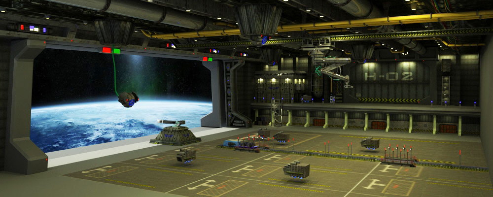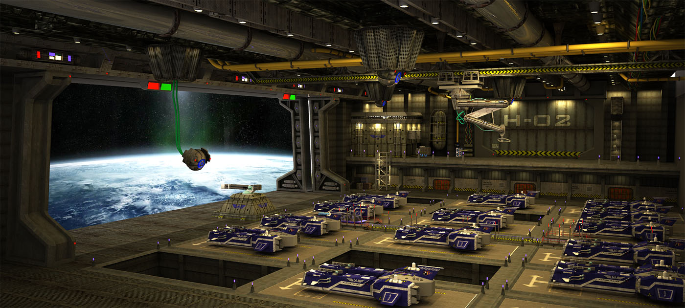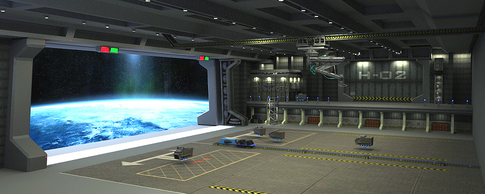 Update del hangar sin la nave, con algunos detalles más, creo que ya he conseguido mejor darle esa sensación de amplitud enorme que quería.
