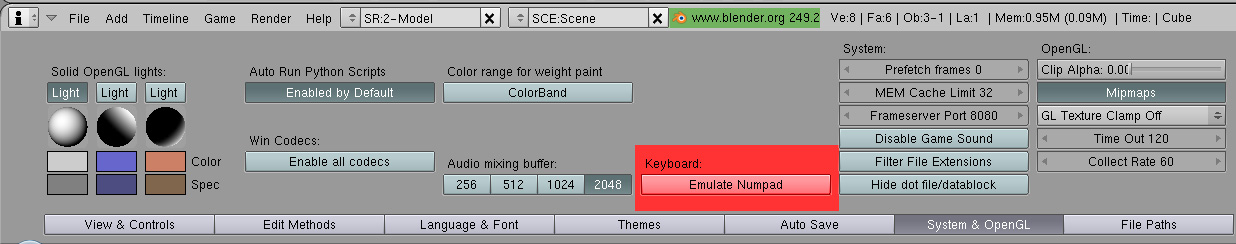 blender 2.4x. En las preferencias de usuario en la pestaña system&OpenGl tienes un botón enorme que pone: [emulate Numpad].
