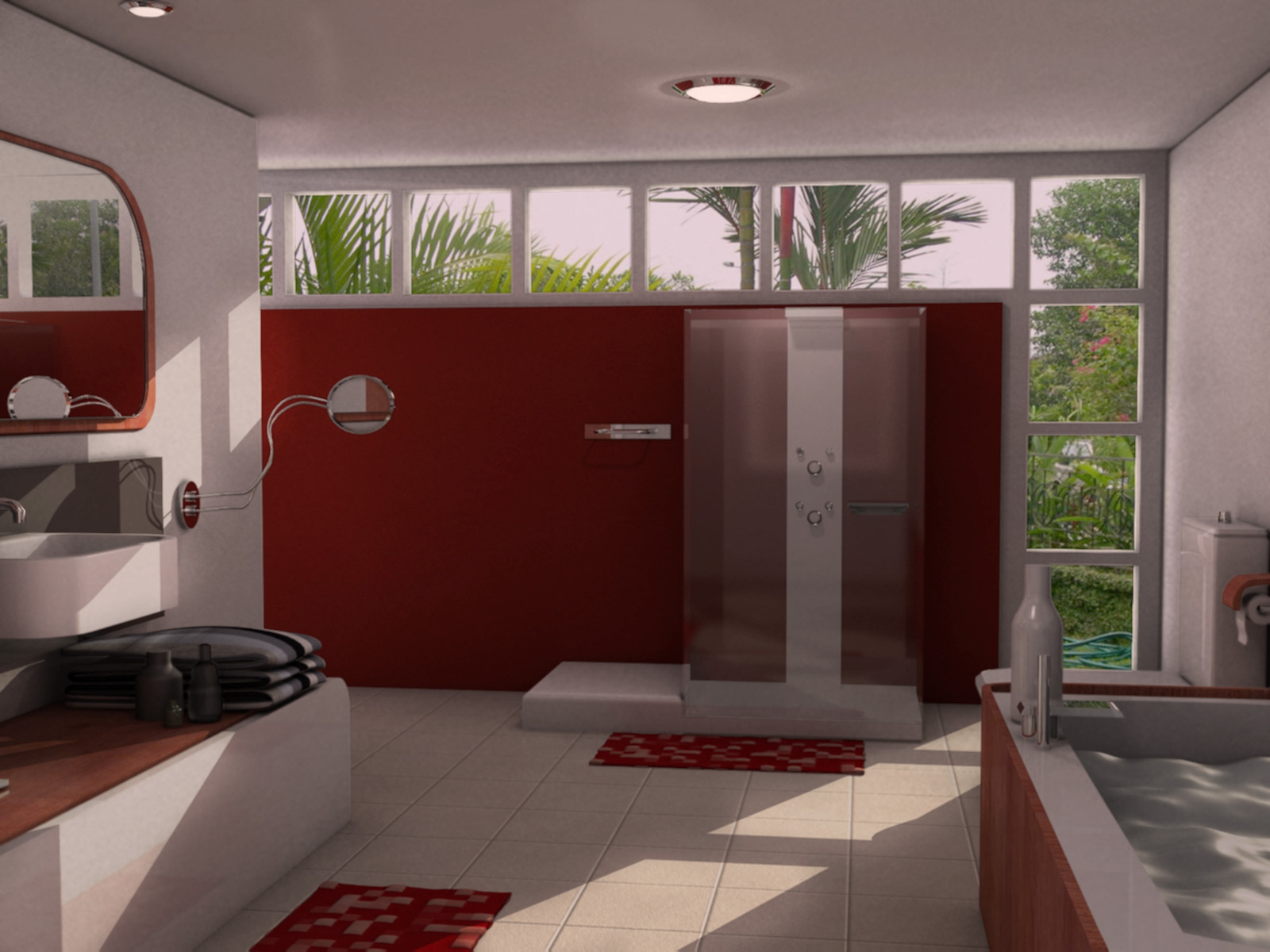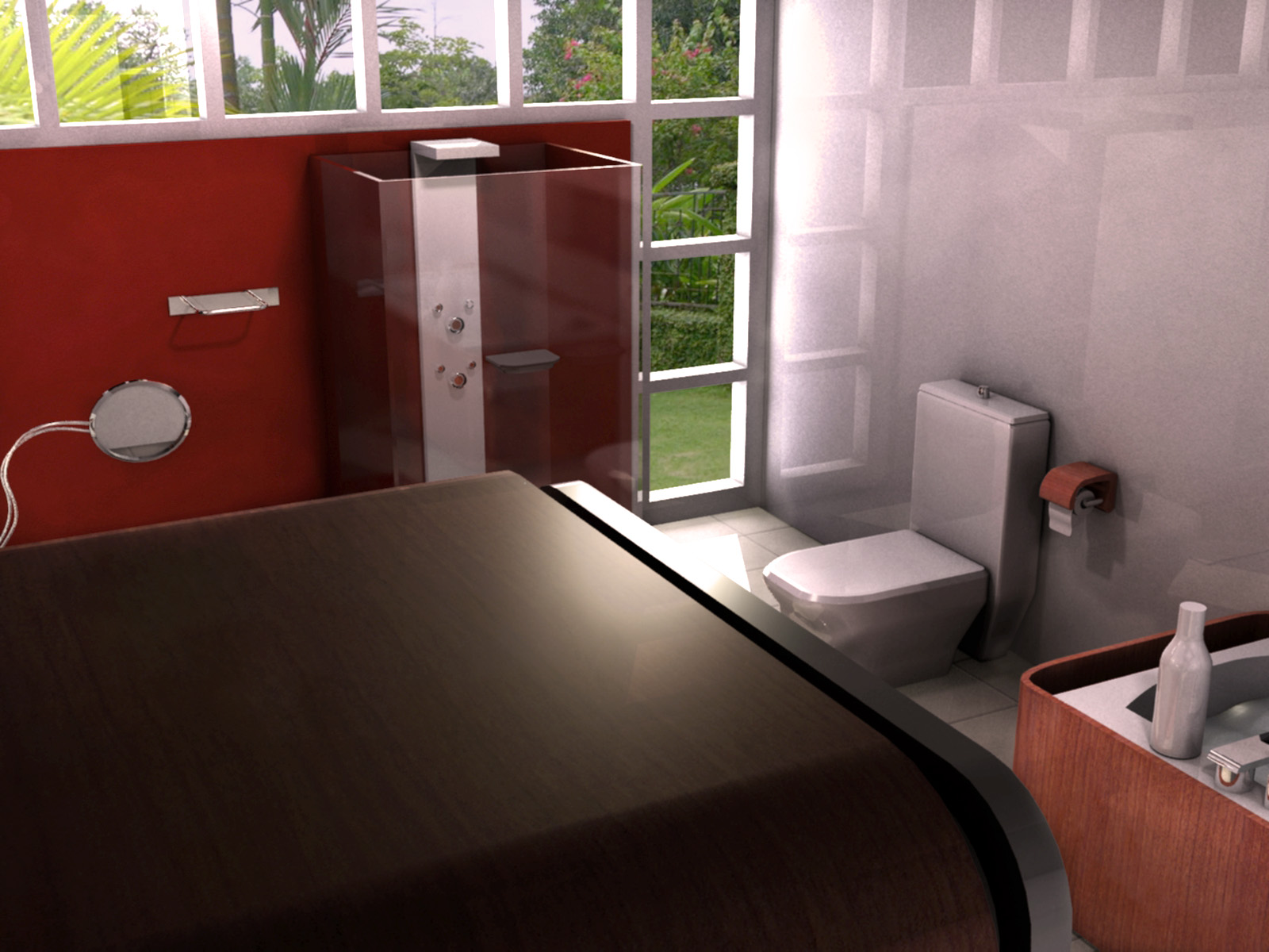 Que tal me ha encantado la calides de tu trabajo esos colores combinados y la iluminación muy acertada. Ahora bien la ducha es eso que se ve enfrente? Parece fuera de escala, el inodoro da a una ventana con vidrio simple? Venga hombre que al menos que el dueño sea exhibicionista de ese tipo (muy (*.rar) por cierto), pon un vidrio esmerilado difuminado o cómo tu lo llames, otra cosa me parece que tus focos están encendidos en pleno día.