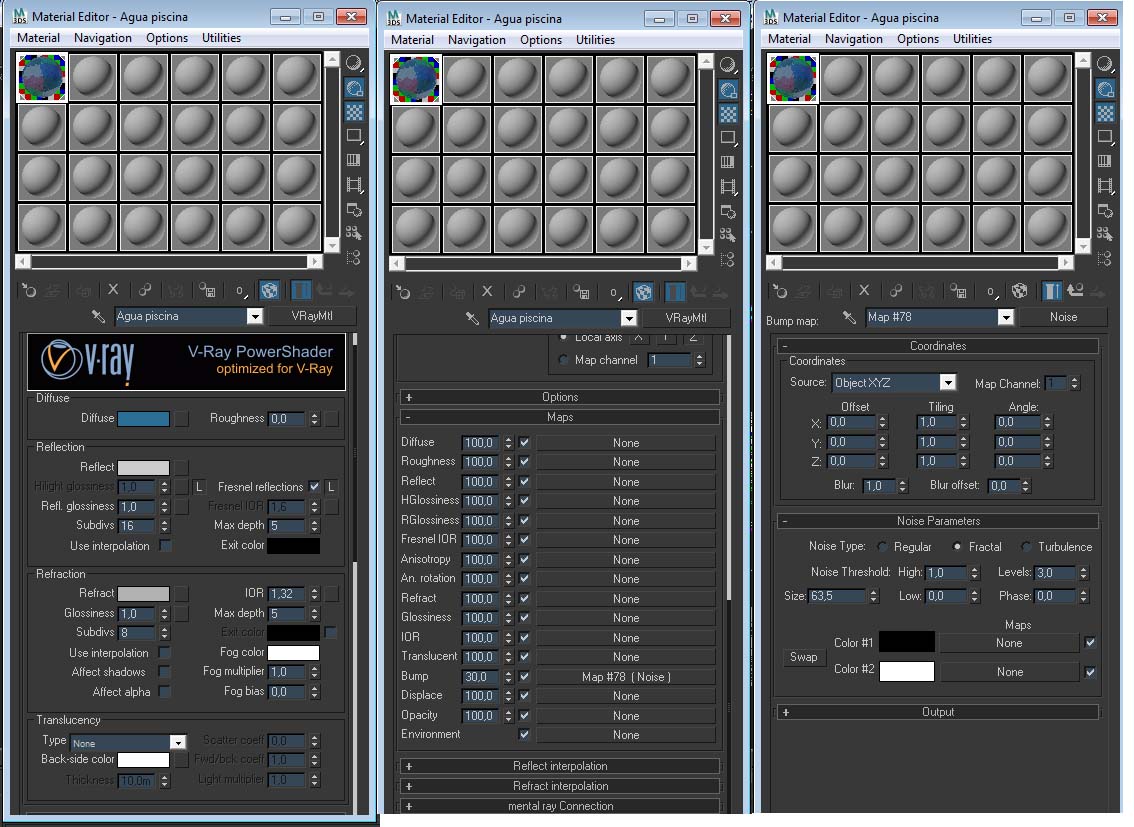 Gracias por vuestros comentarios y ahora a ver cómo os respondo. En cuanto al agua que lo habéis dicho muchos y la verdad que a mí tampoco me convencía está hecha con un material de Mental Ray, las refracciones y reflexiones si son las correctas, aunque quizás podría tintar un poco la refracción, y es el ruido del objeto el que yo creo que haga que se vea tanrara.