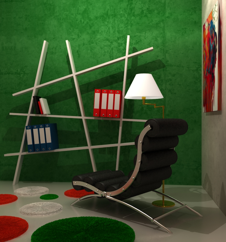 Me gustó mucho el material de metal del sillón. En cuanto a lo demás para mí le falta detalles a la iluminación, por ejemplo, la lámpara al ser tan blanca da la impresión de estar prendida, pero no produce ningún reflejo ni sombra en el sillón, lo cual no encaja. Te recomendaría en primer lugar meter adentro de esa lámpara una omni light con sombras activadas.