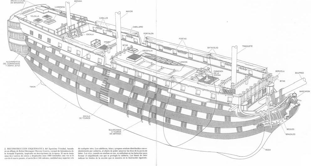 El más grande navio que ha surcado los mares, temido por los ingleses y hundido por tres de estos en trafalgar. Si queréis el resto de los planos os vais a su web. http://santísima-trinidad, astillero.net/.
