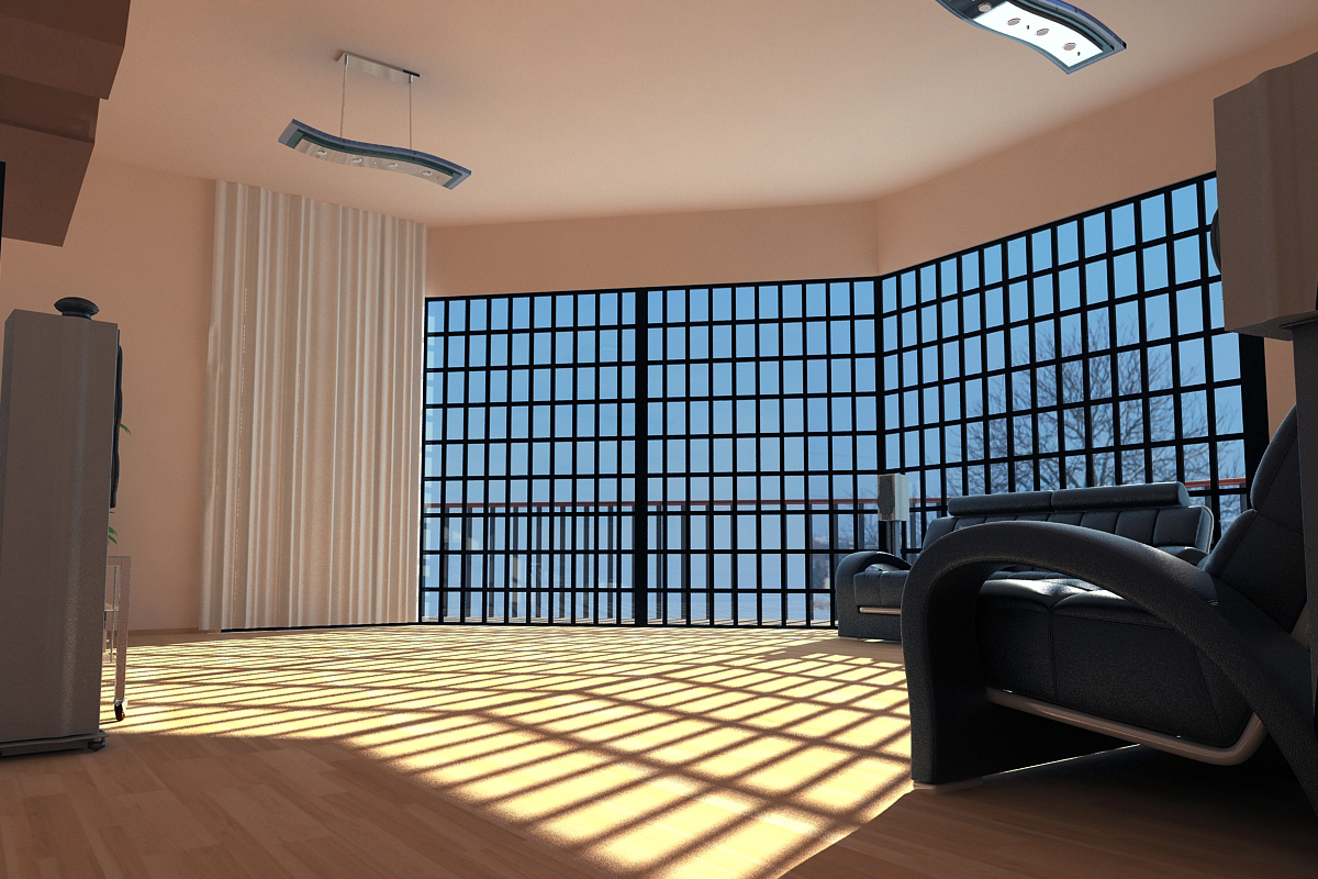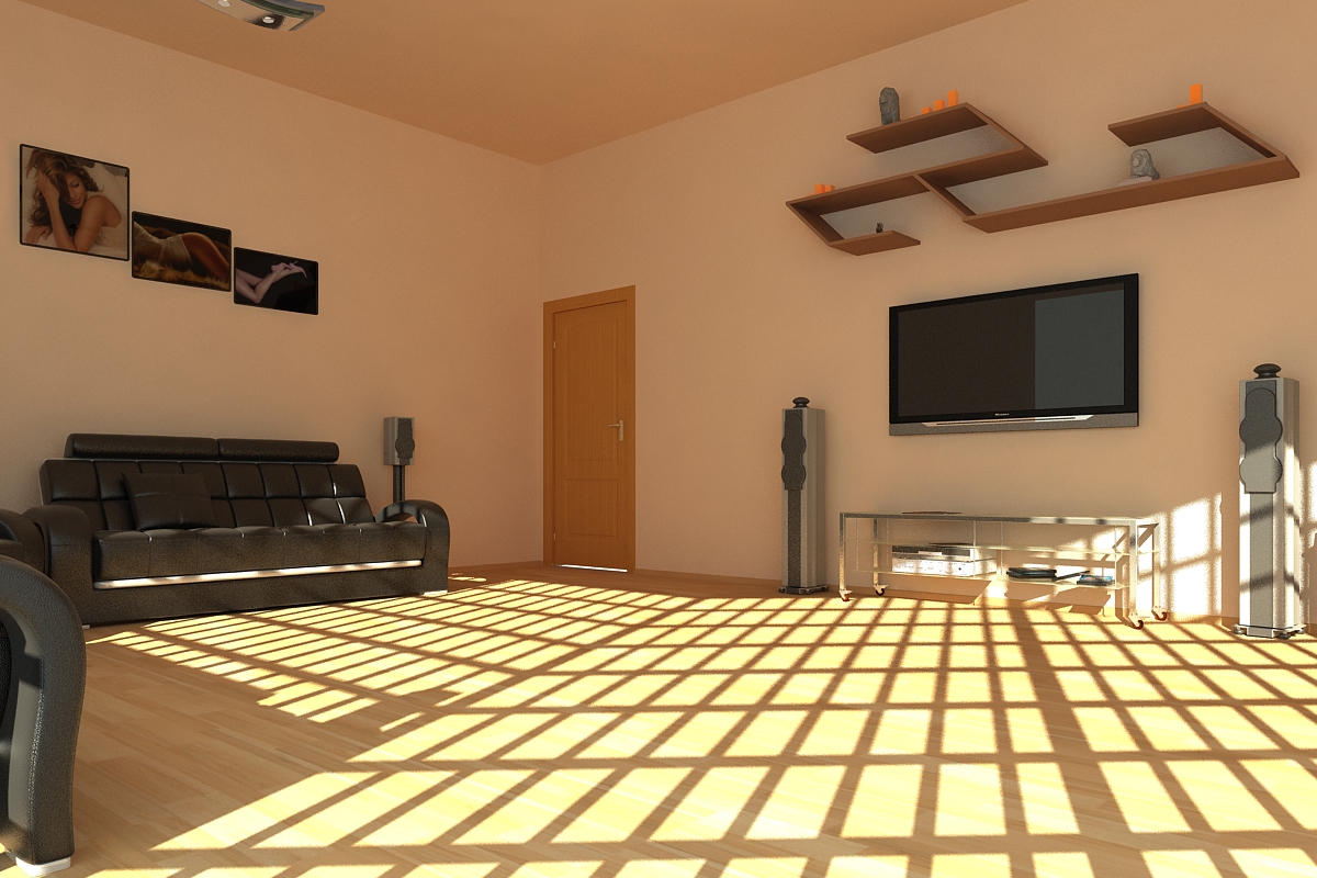 A nivel texturas lo veo bastante bien, ¿cómo lo del sillón, mesita de vidrio, la pecera etc, lo que no me convence es mayormente el piso, le noto mucho ruido en dónde el sol pega y en dónde no pega, faltaría cierto brillo, ¿puede será.