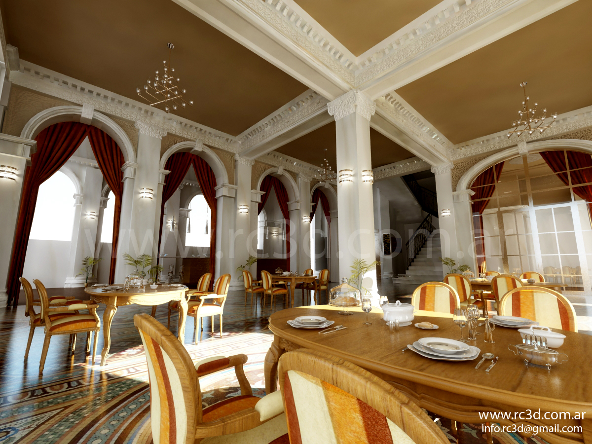 La imagen me parece que está muy bien, pero veo algunas cosas que no me gustan. Efectivamente las ventanas están blancas y en el fondo las escaleras se ven con manchas. En cuanto a la composición, creo que las lámparas de techo no pegan, para mí que deberían ser más monumentales como el resto del interior, parecen muy poco visibles entre tanto detalle. Los cubiertos están mal colocados, la cuchará va por fuera.