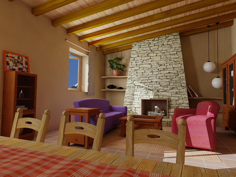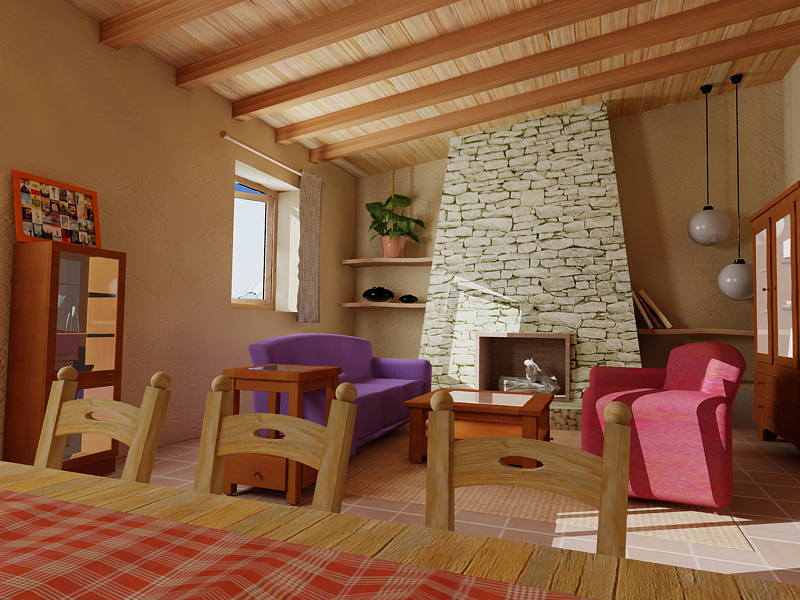 -La textura de piedra, creo que es de lo mejorcito que tienes en el render, pero aun así le falta mucho realismo, esos bordes de la chimenea de piedra, si es supuestamente piedra no pueden ser tan rectos, deberían sobresalir cada piedra pues un poco y verse un borde irregular, ¿no? Pues aplica un Vray displacement.