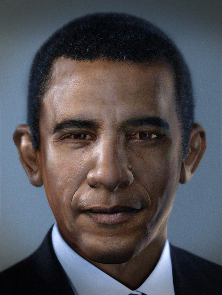 Muy conseguido, para mí gusto con una piel demasiado resplandeciente, pero es que, tantas horas bajo los focos de la sala de prensa de la casa blanca.