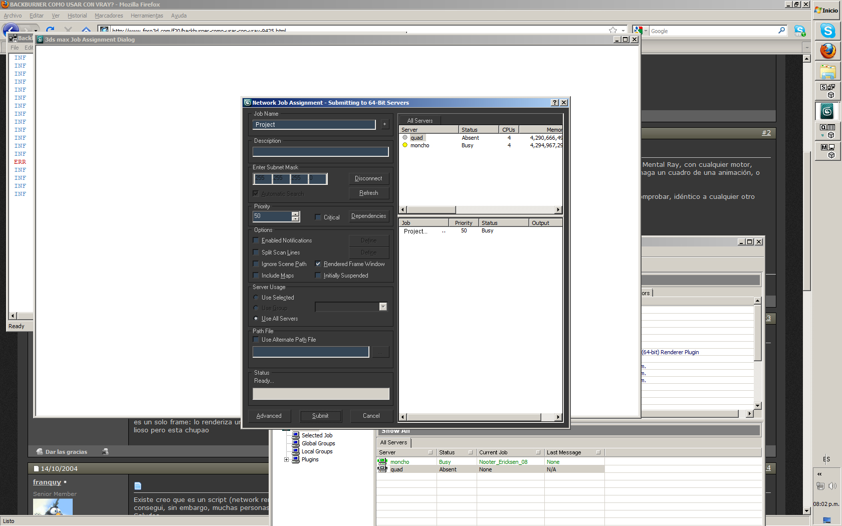 respuesta de JCV3D : siempre se te va a quedar minimizado en todos los PC que tengas en red, no se te abrirá nunca en el PC que vas a renderizar, en la parte que dice system activar la casilla (distribuir render) y allí asignas o lo que es lo mismo adicionas, los PC que vas a utilizar en la tarea le pones el nombre que tienen cada uno, por ejemplo, pc01-pco2.etc, (como le pones el nombre a cada PC, fácil tocas el icono mi PC y buscas sus propiedades y le pones cambiar nombre, ahí le pones pc01, o p1 o cómo quieras) la IP cómo? Vas a conexiones de red pones propiedades de cada máquina y en la parte tc/ip pones propiedades, allí le pones o miras la dirección asignada el último número será el identificador de cada máquina, por ejemplo. 169.154.0.1 que se yo, por ejemplo, y listo, eso es todo, puedes mandar tu render.