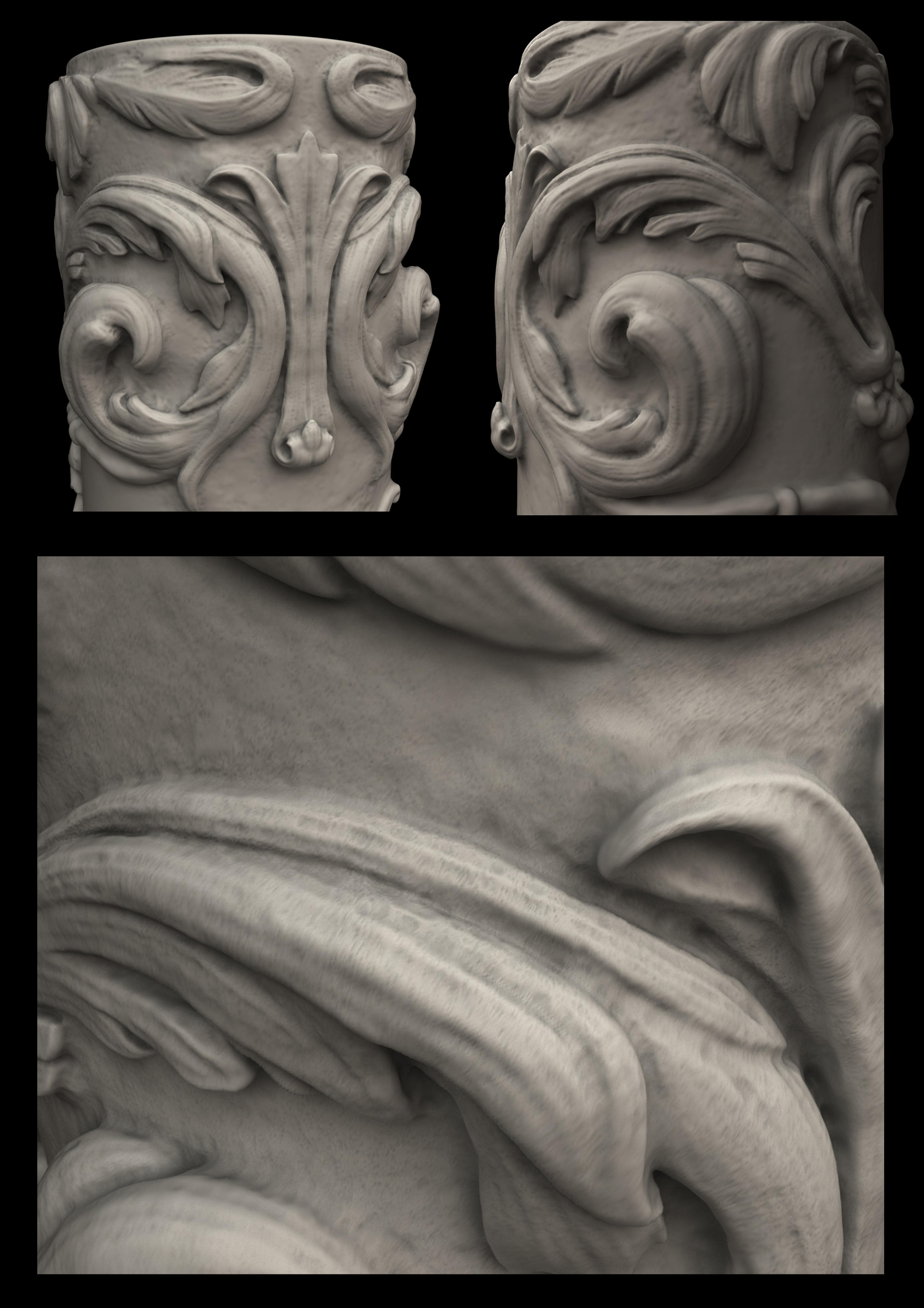 Os adjunto unas imágenes de lo que estamos haciendo en estos momentos como referencia del nivel mínimo que exigimos. Una es la captura de pantalla de ZBrush y la otra varios renders sacados en 3dsmax sin textura.