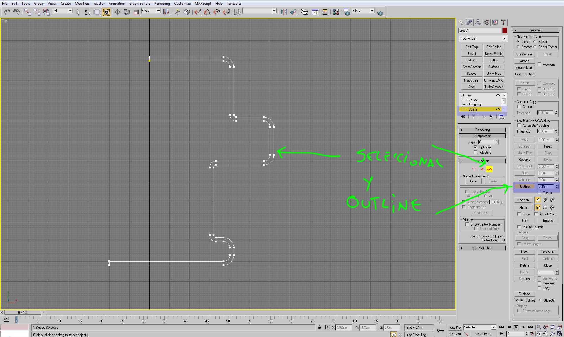 3 ahora seleccione el subobjeto, Spline y aplicas outline, con la distancia que deses.