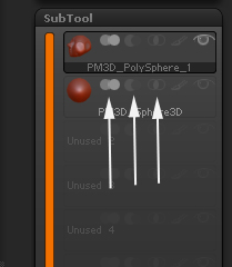 Los otros dos botones: el pincelito significa que esa subtool tiene la función colorize (o polypaint) activada y el ojete que esa subtool esta visible.