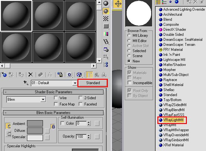 Si no lo encuentras, fíjate si aparece como una bola blanca pálida y sólida, sin sombra, ese debe ser el vratlightmtl, sino será que no tendrás el Vray o no lo tendrás como motor render.