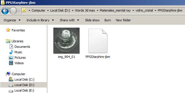 No te mando la respuesta, ok ahora si, primero descargamos el archivo, una ves echo se te abre el winrar con una carpeta que dice, pgstarphore-jbm, ok sin salir de ahí le haces doble click, y verás un (*.jpg) normal y otro que es el raro, pues ahí y sin salir de ahí clickeas con el botón derecho del ratón en el archivo raro y te vas a hasta ver fichero y ahí mismo lo ves luego lo llevas a tu librería a la de metal ray como los de Vray similares se manipulan igual.
