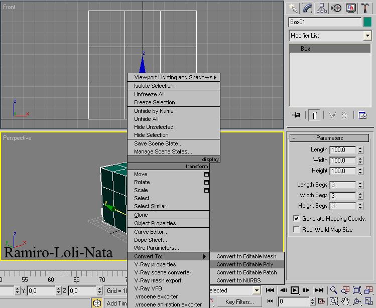 2.- Convierta este cubo en Editable Poly, con mouse derecho sobre el nombre box, que se encuentra en la persiana derecha.