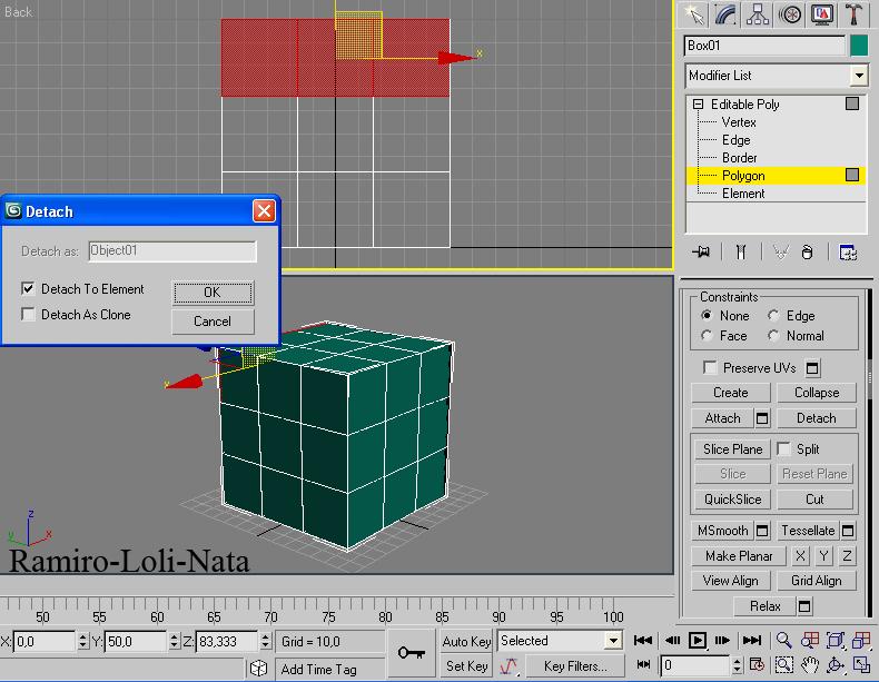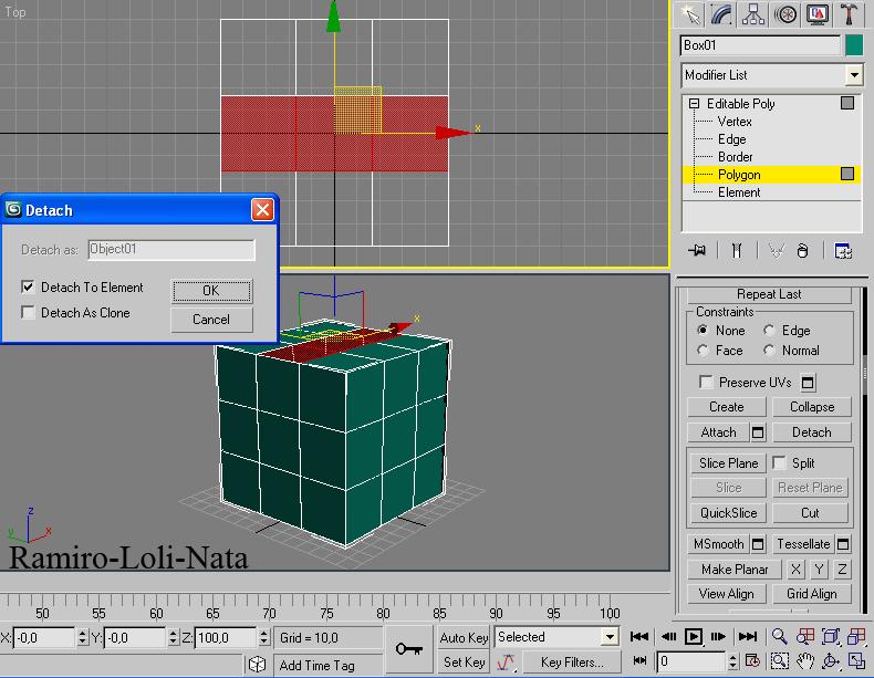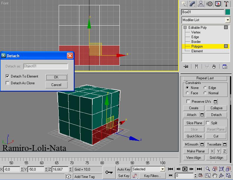 4.- En la vista izquierda (left), seleccione los tres polígonos del lado extremo izquierdo, y en la persiana edit geometry apretar sobre detach y seleccionar detach todo element y luego aceptar con ok.
