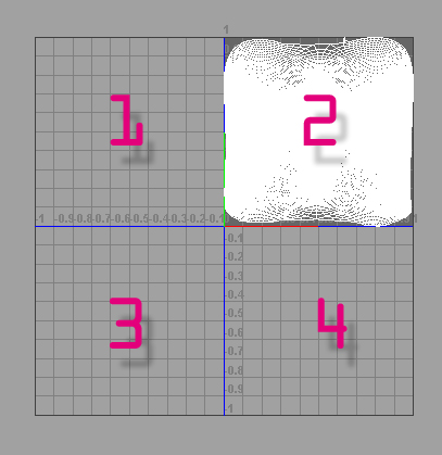 1- Maya. Cuando mapeamos un objeto siempre colocamos la malla 2d en el cuadrante positivo de los ejes x e y [en la imagen > el número 2].