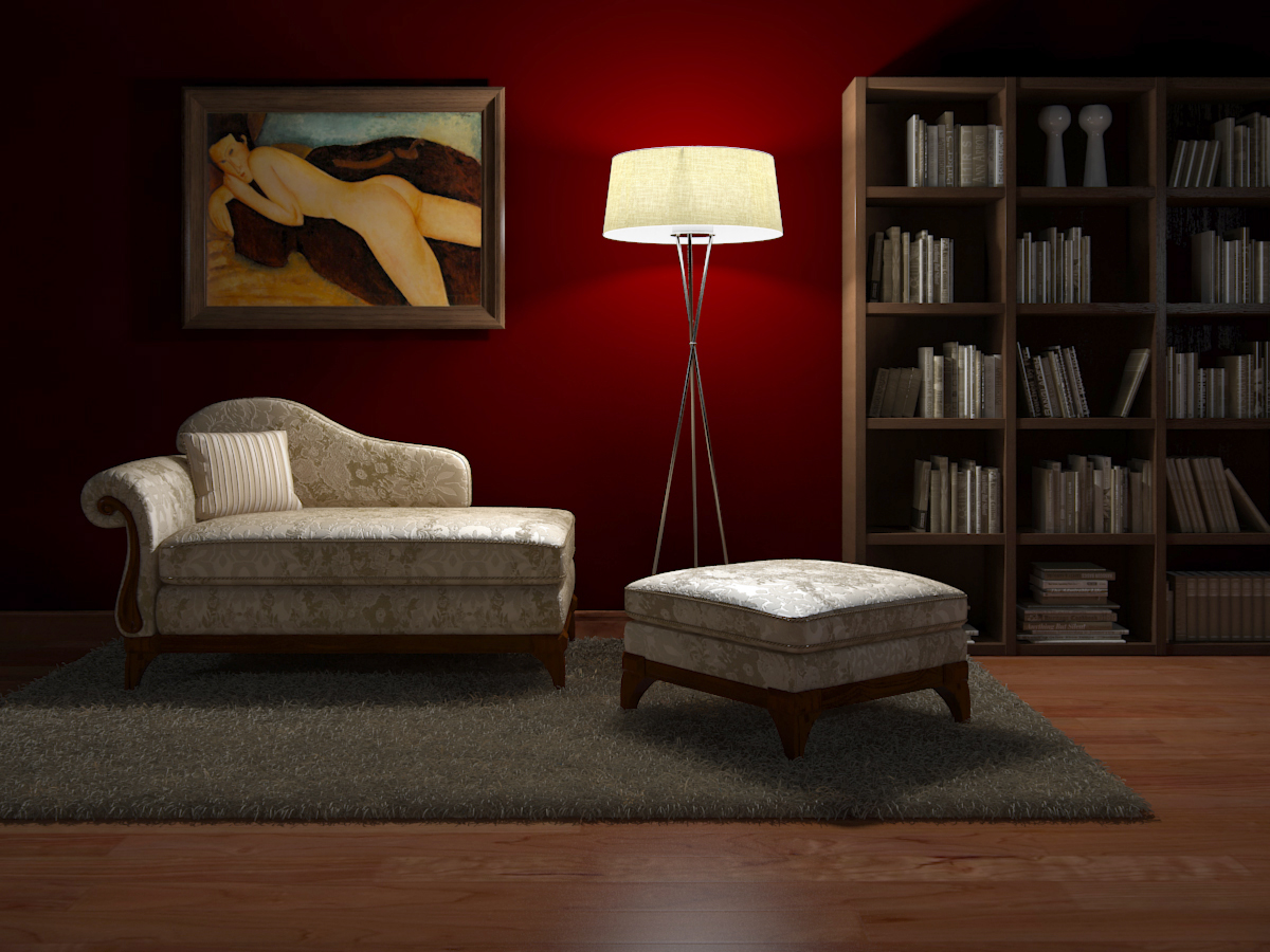 Hola. Reduciría algo el brillo del metal de la lámparara. T eha quedado bastante bien la textura de los sillones.
