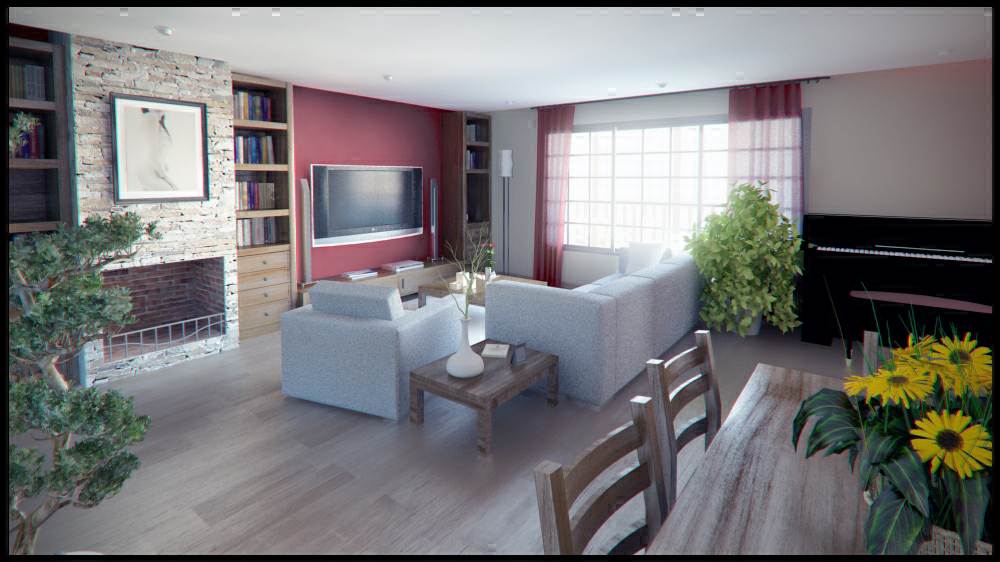 Hey, muchas gracias por responder. Estoy de acuerdo con lo de la imagen del salón, desentona un poco, tengo que darle más vueltas, aunque es cierto que prefiero el mueble más sencillo y minimalista que el barroco rústico. La piedra se ve quizás demasiado plana, ¿verdad? Le meteré un displace en lugar de Bump.