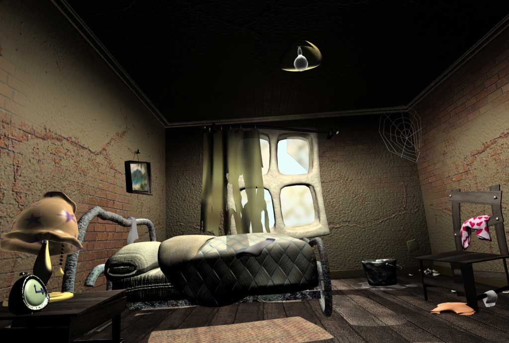Tampoco me convence la mesa de noche, métele un poco de biselado y deforma sus bordes, para que está más acorde con la escena.