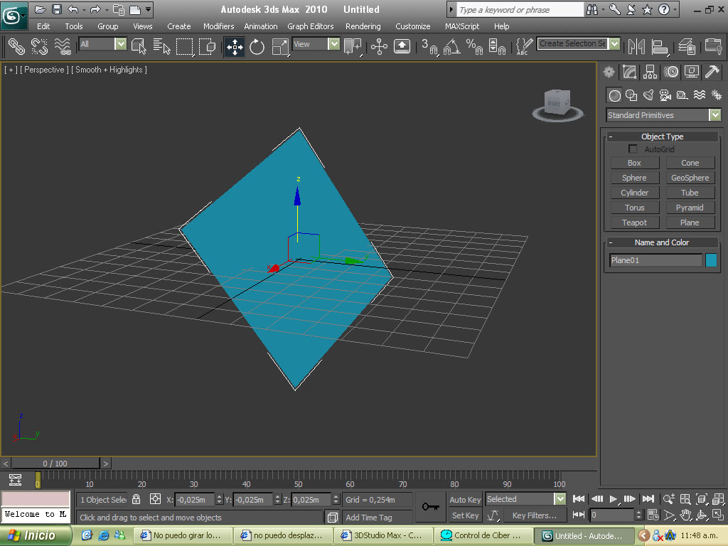 Problemas con el 3dsMax 10. Hola que más. Como les va. Bueno les cuento que el día de ayer estaba trabajando en el 3dsMax 10 y de un momento a otro al momento de crear algún objeto, una primitiva, una cámara, un foco lo crea torcido como si los ejes estuvieran desubicados, aparte de eso tampoco puedo mover, girar ni escalar.