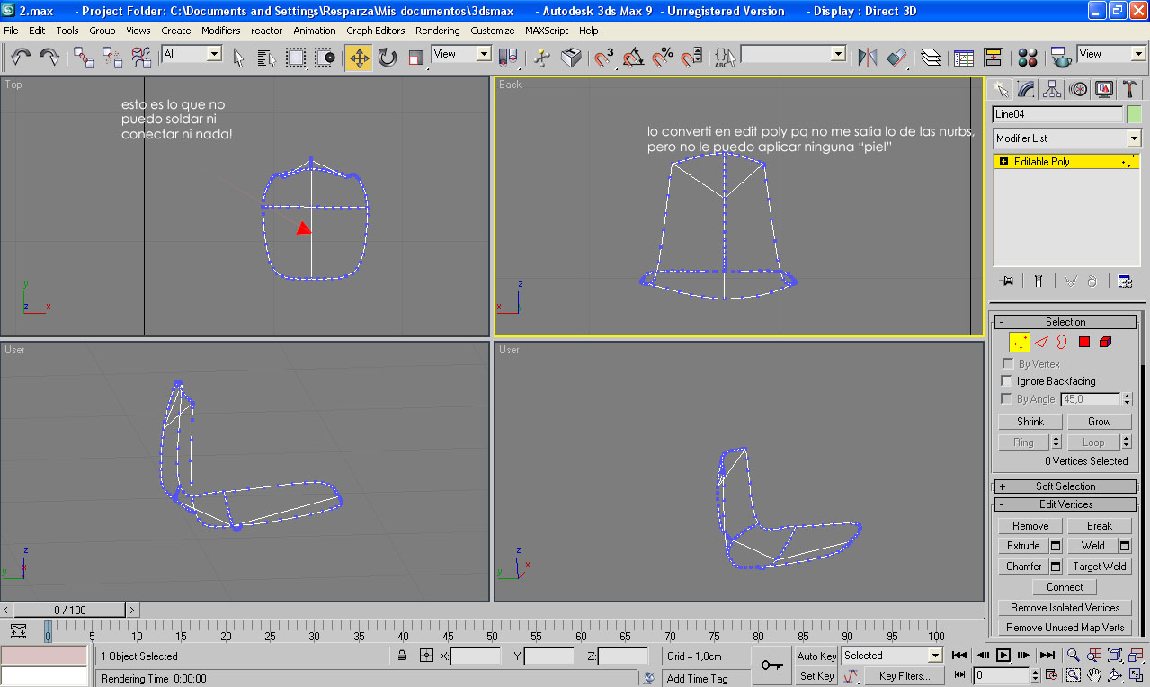 Estoy viendo tutoriales, leyendo manuales, pero nada no me sale. He probado a modelar con esferas, con cilindros, con Splines (soy un auténtico desastre en esto, no se ni conectar los vértices, y leyendo es super fácil).